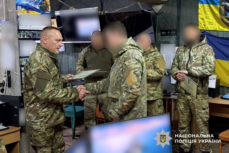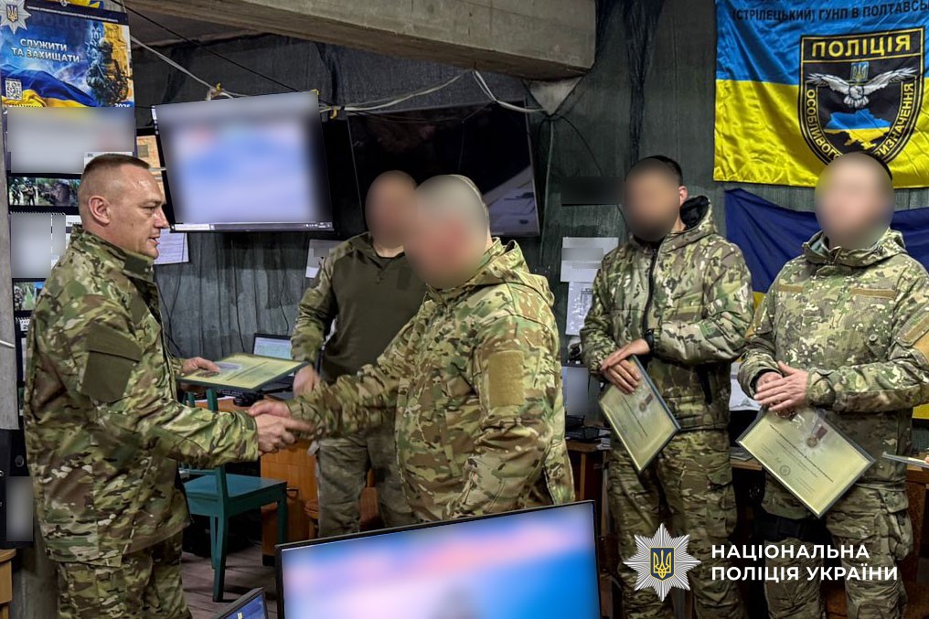 Заступник начальника поліції Полтавщини Віталій Мельничук відвідав місце дислокації бійців батальйону поліції особливого призначення (стрілецький) та вручив державні нагороди поліцейським, які у складі Сил безпеки та оборони України виконують бойові завдання.