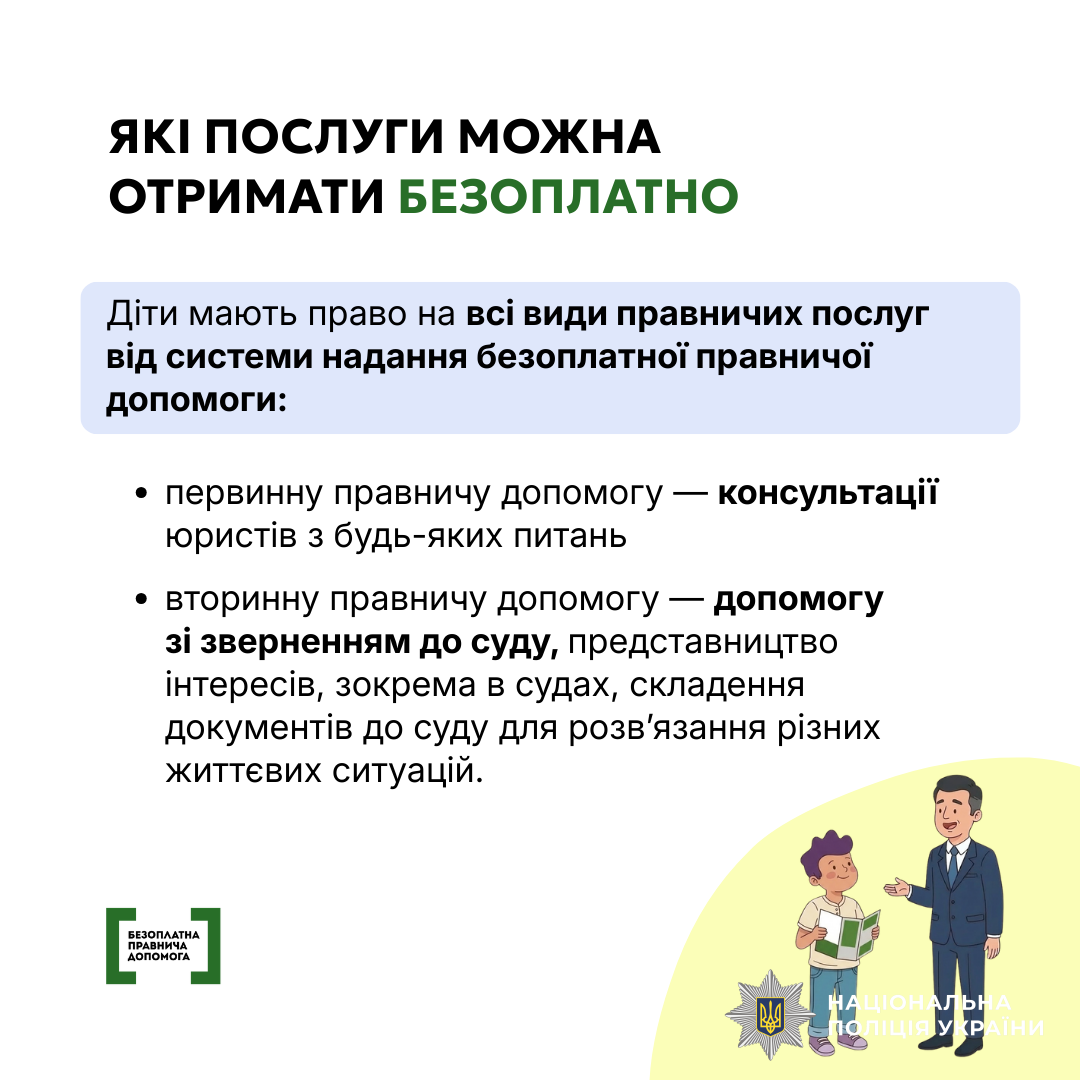 Кожна дитина має право на безоплатну правничу допомогу — від консультацій до представництва інтересів, зокрема у суді. Отримати ці послуги можна від системи надання безоплатної правничої допомоги (БПД).