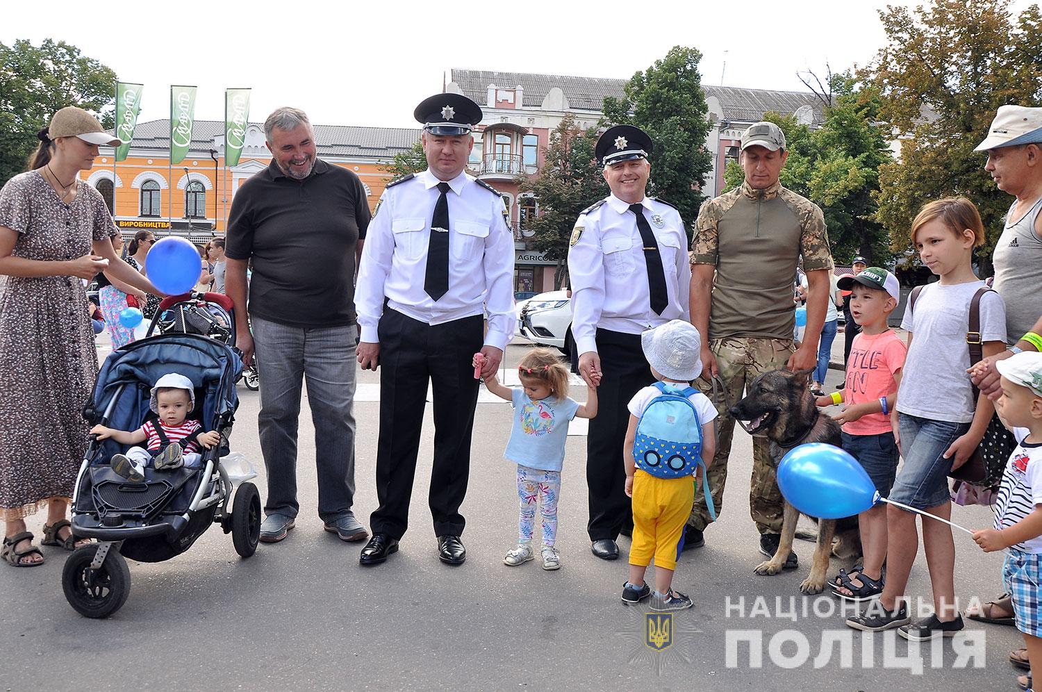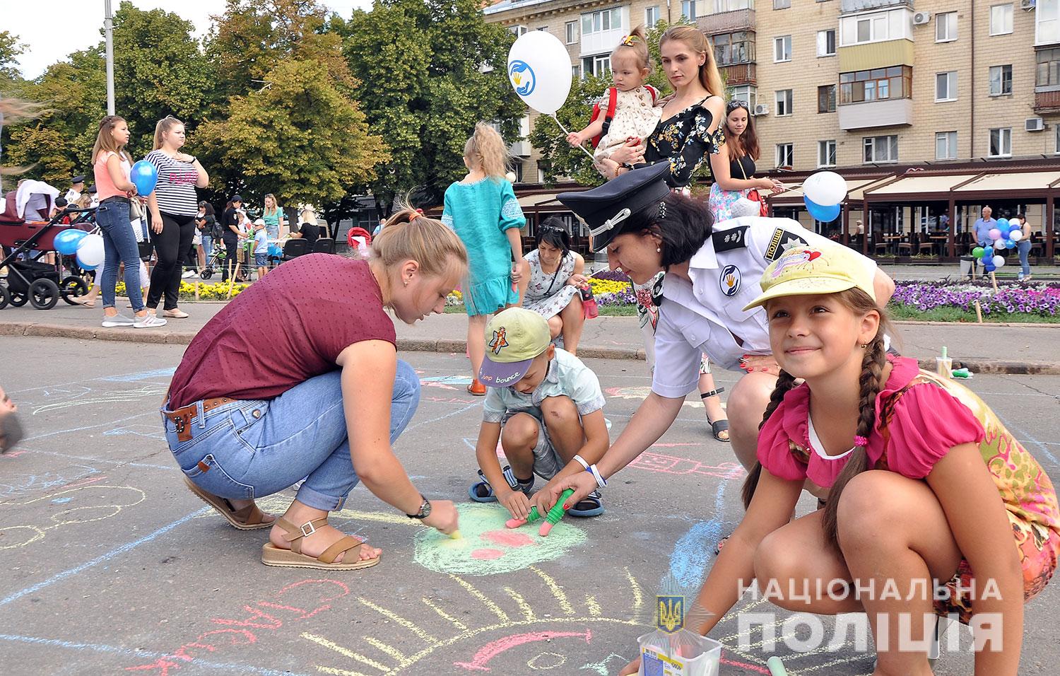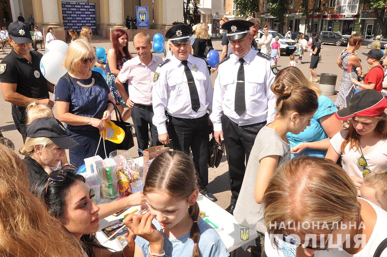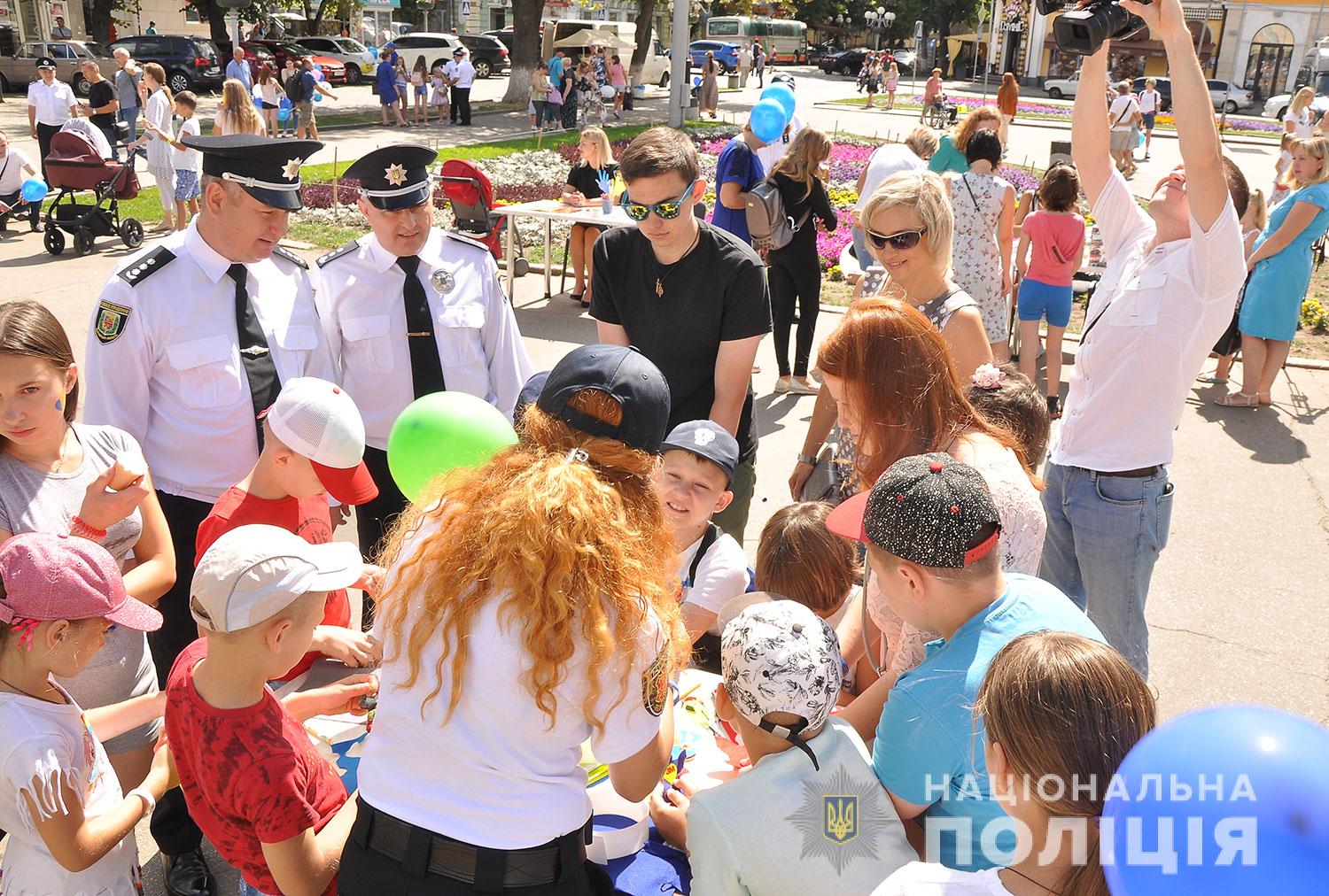 Сьогодні на площі, біля театру ім. М. В. Гоголя, поліцейські розповідали про обраний фах, відверто відповідали на запитання дорослих і дітей, ділилися цікавими історіями з власного досвіду, навчали дорожній «грамоті», фотографувалися на згадку та малювали на асфальті.