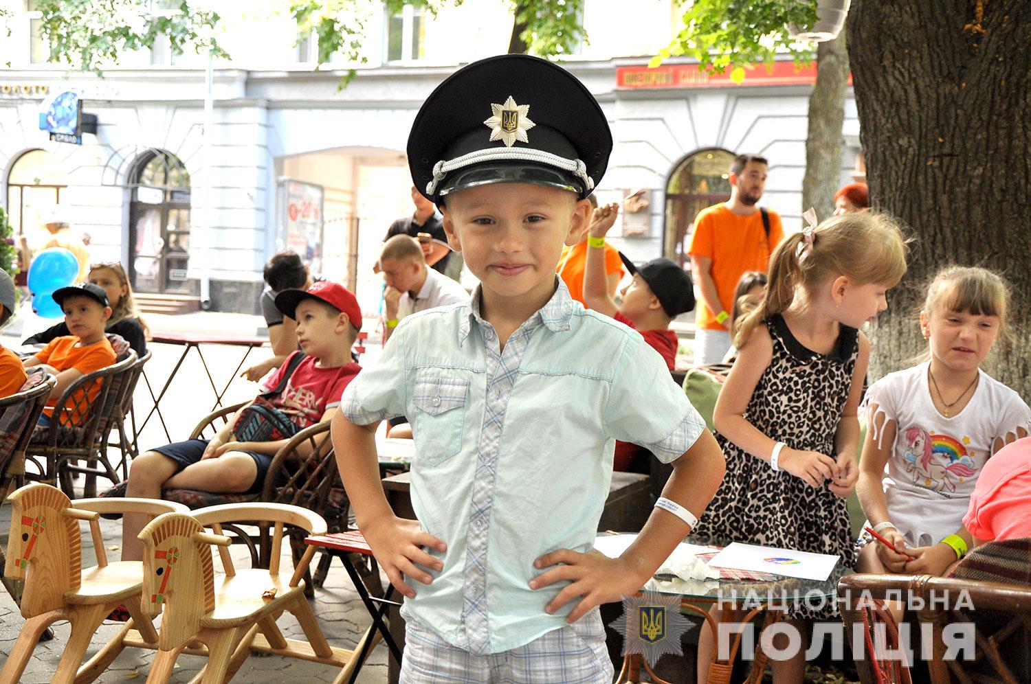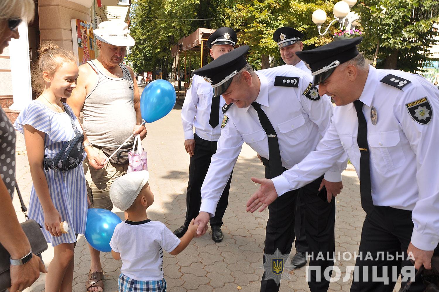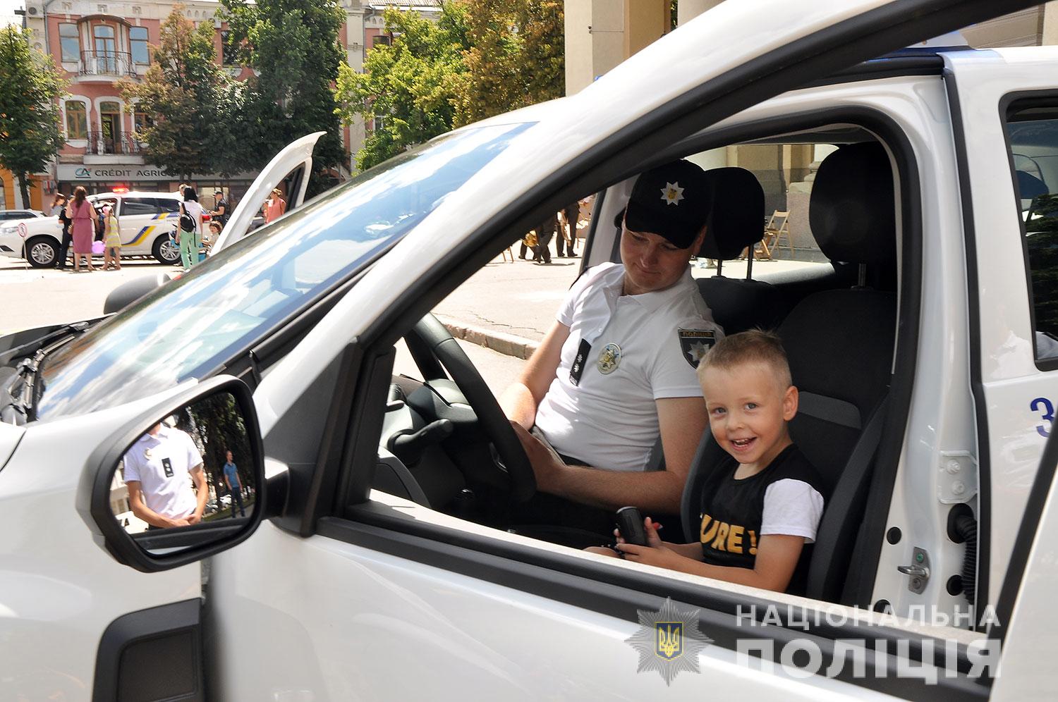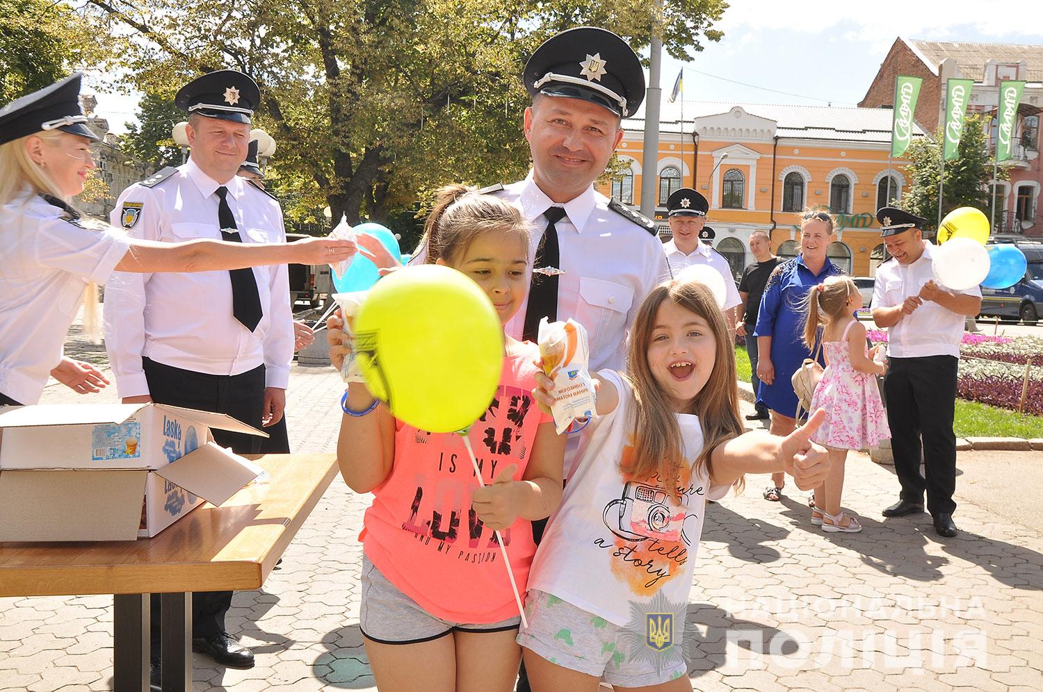 Сьогодні на площі, біля театру ім. М. В. Гоголя, поліцейські розповідали про обраний фах, відверто відповідали на запитання дорослих і дітей, ділилися цікавими історіями з власного досвіду, навчали дорожній «грамоті», фотографувалися на згадку та малювали на асфальті.