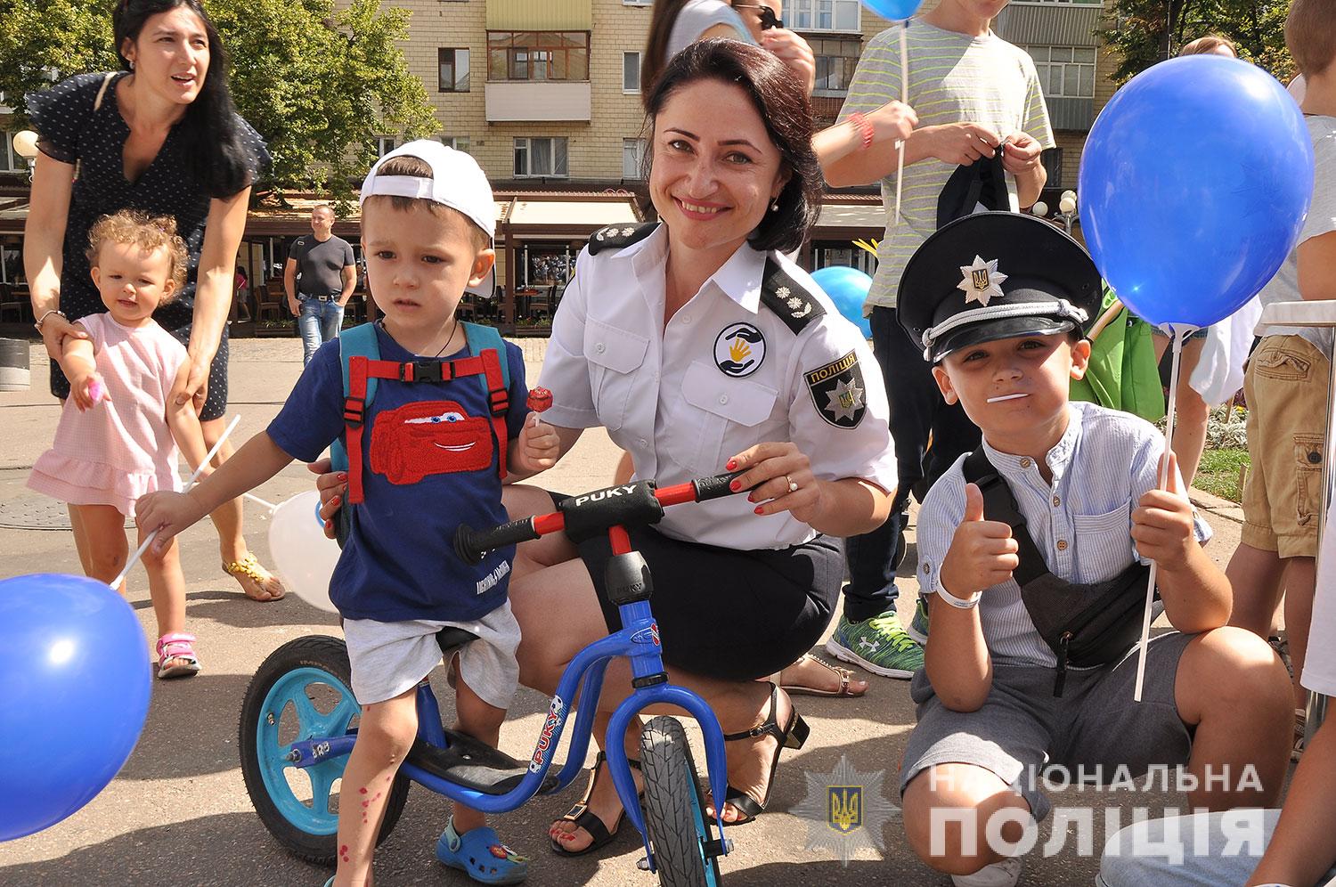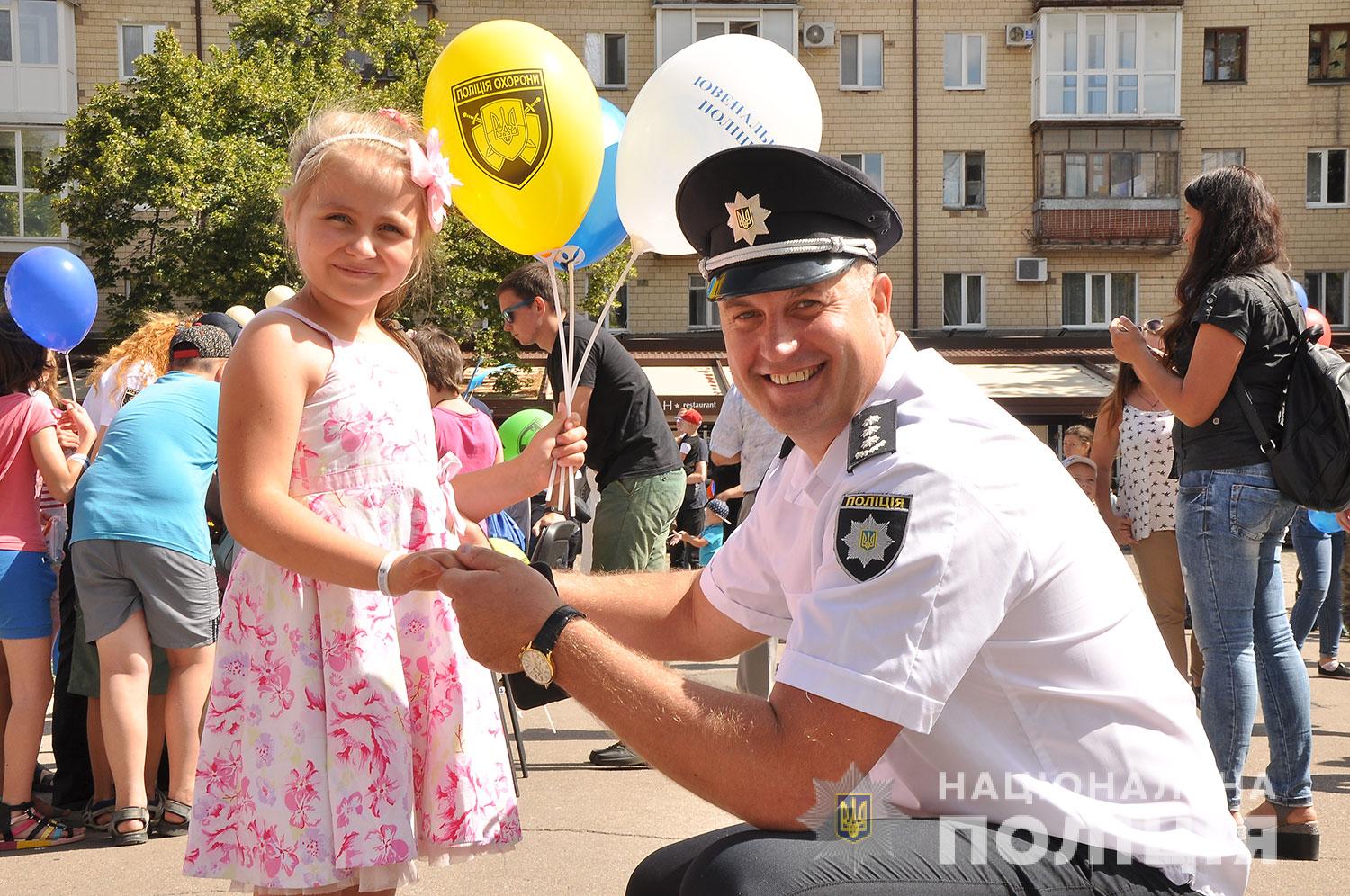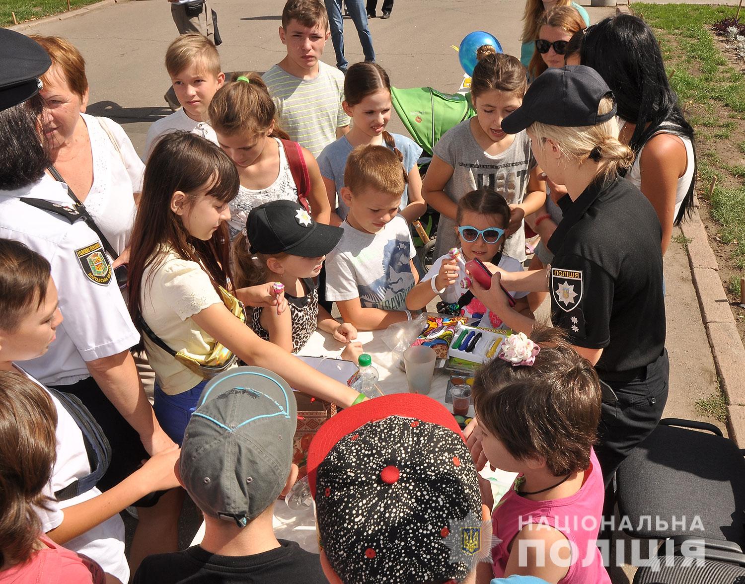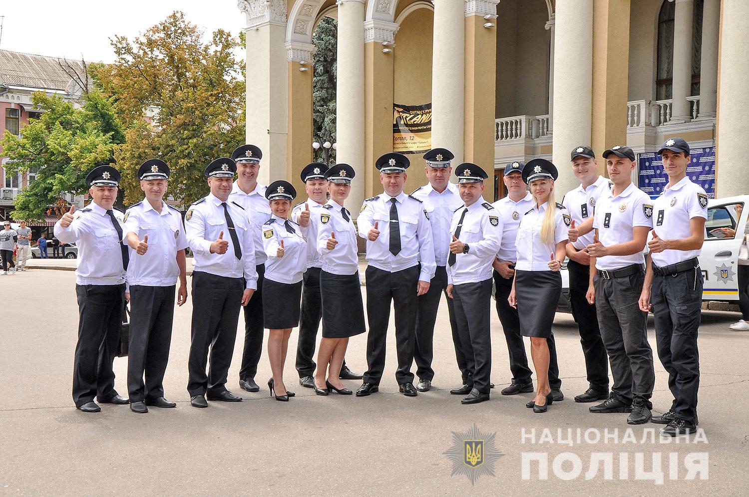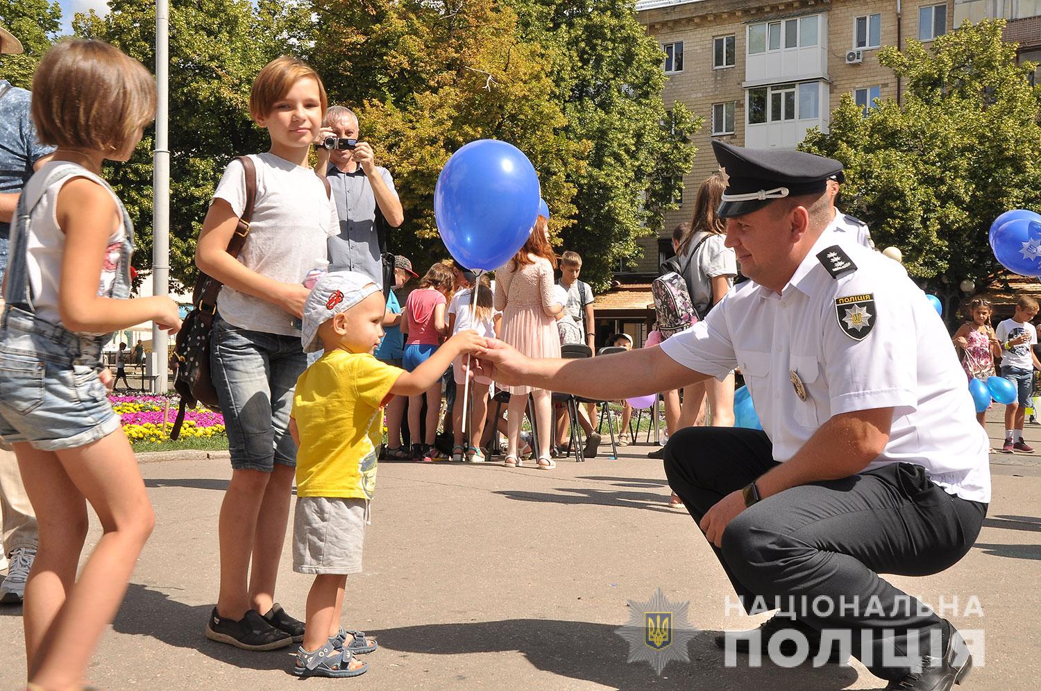 Сьогодні на площі, біля театру ім. М. В. Гоголя, поліцейські розповідали про обраний фах, відверто відповідали на запитання дорослих і дітей, ділилися цікавими історіями з власного досвіду, навчали дорожній «грамоті», фотографувалися на згадку та малювали на асфальті.