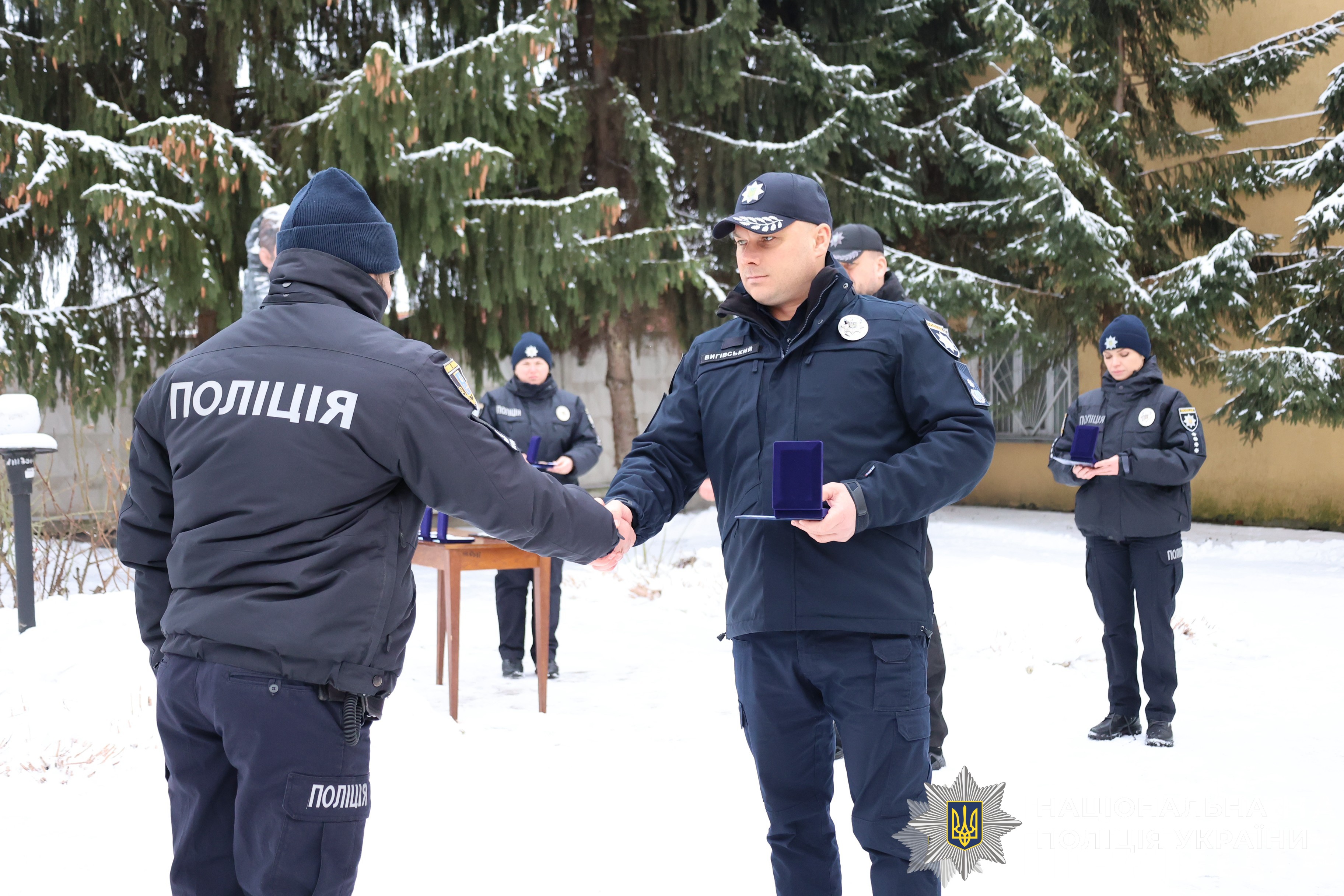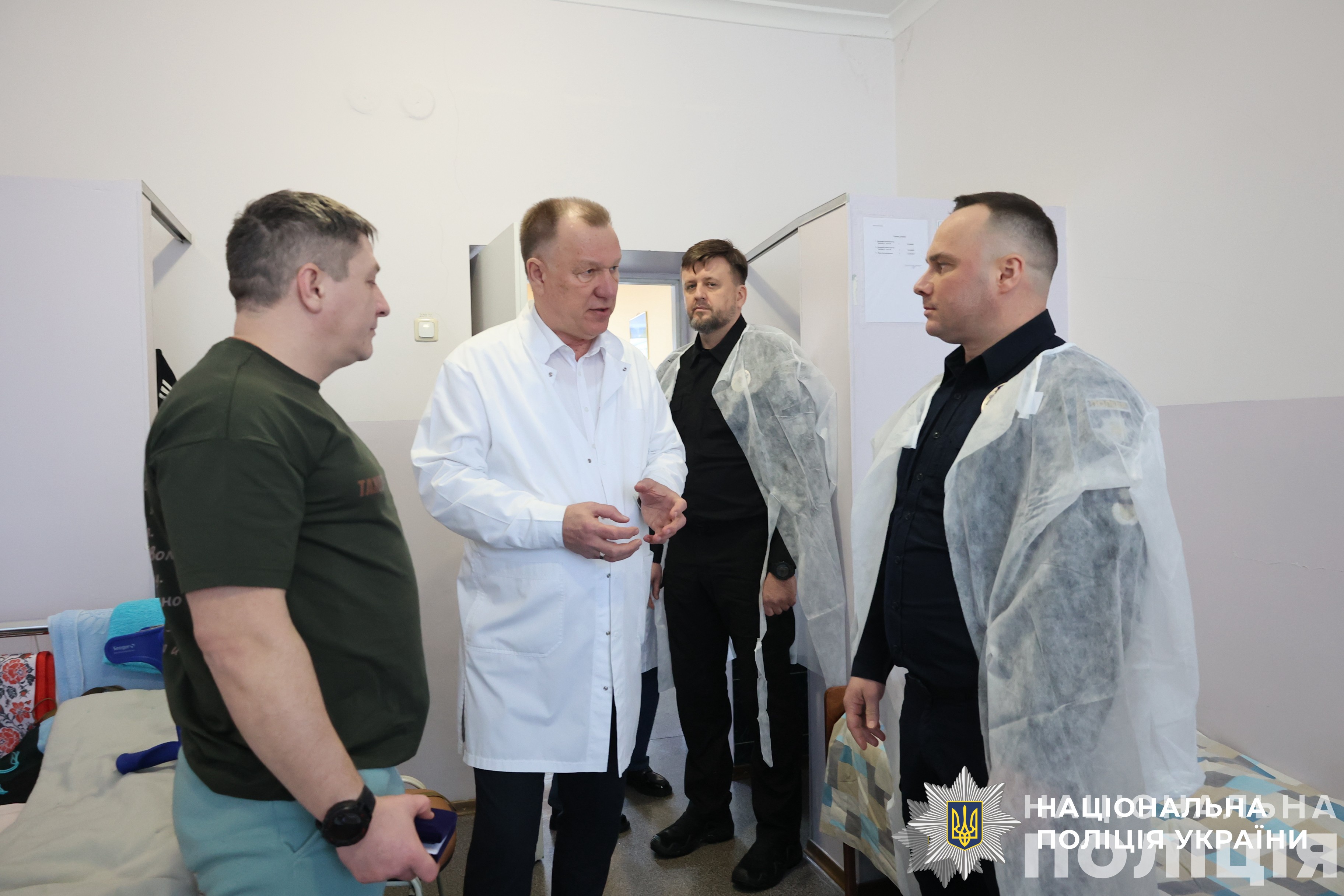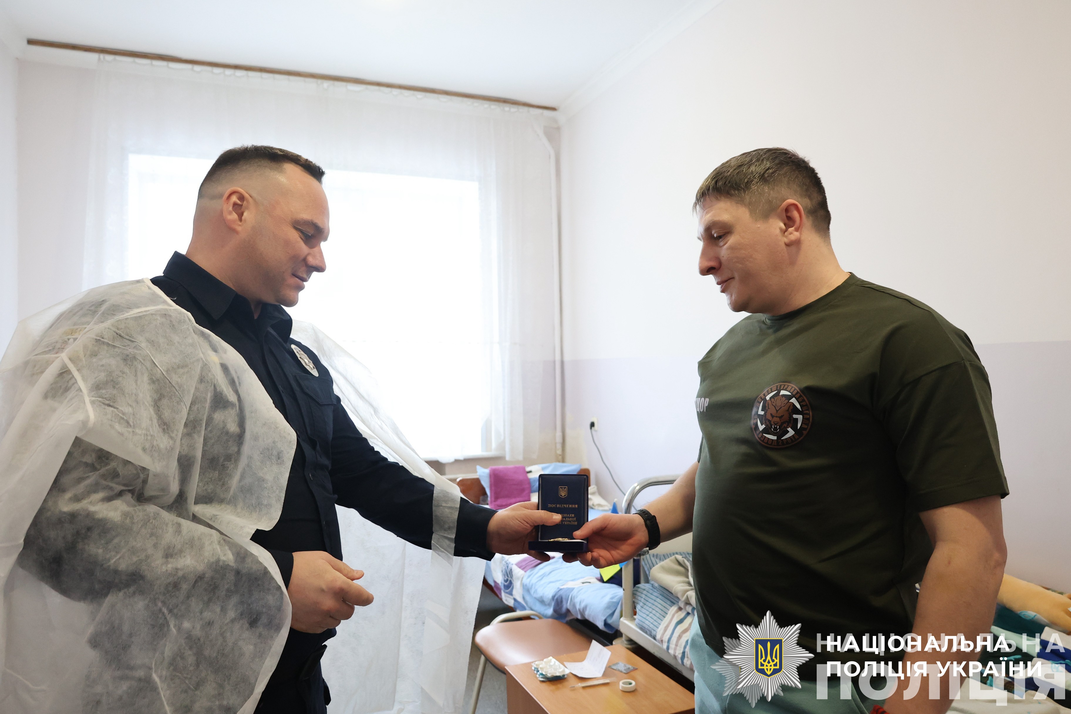 Також очільник відомства відзначив за самовіддану службу пораненого поліцейського-захисника штурмової бригади Нацполіції «Лють». Він проходить лікування та реабілітацію у обласному медзакладі МВС. До служби у бойовому підрозділі Нацполіції воїн був слідчим. Іван Вигівський поспілкувався з лікарями, які надають допомогу пораненим співробітникам, та подякував за лікування та реабілітацію захисників.