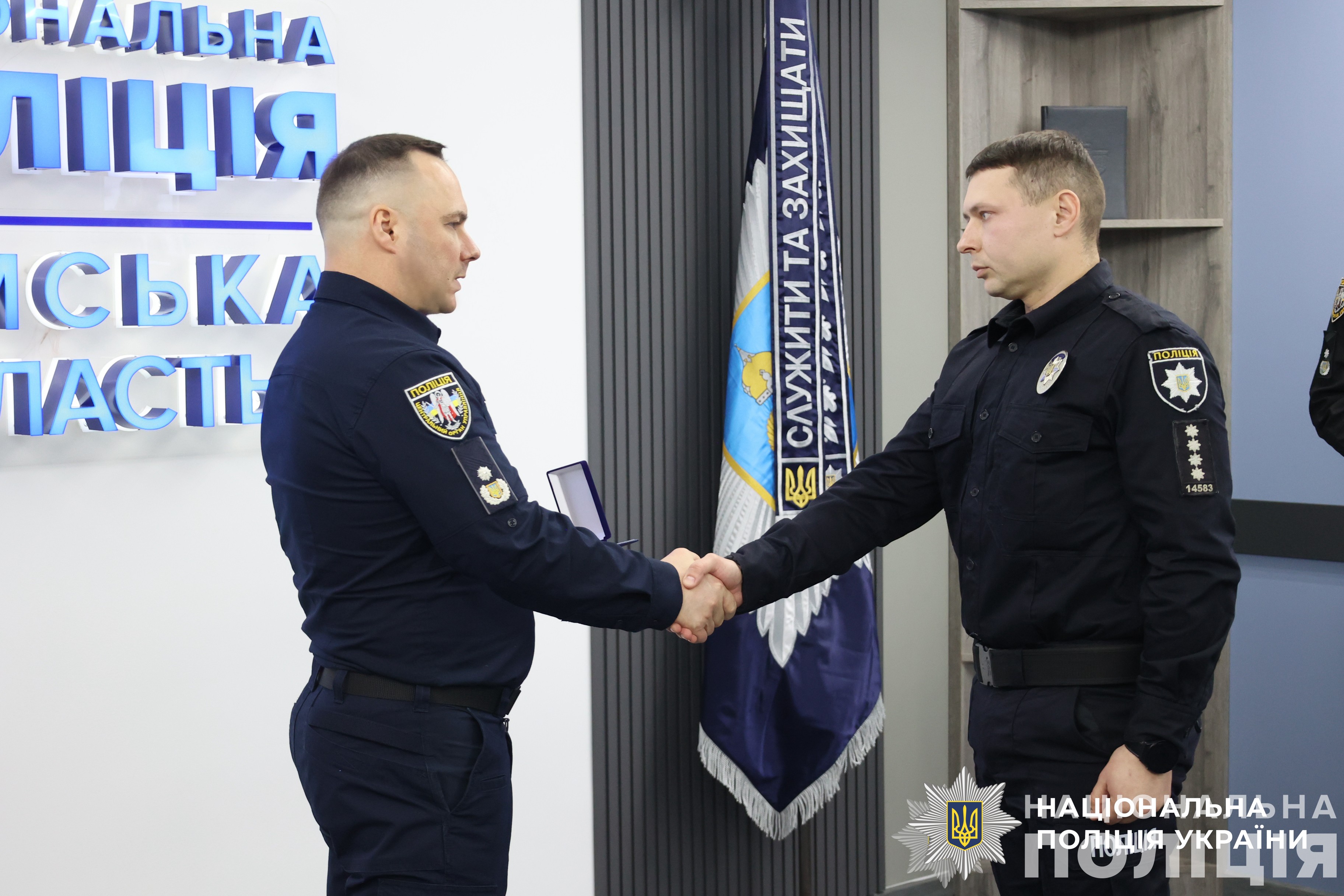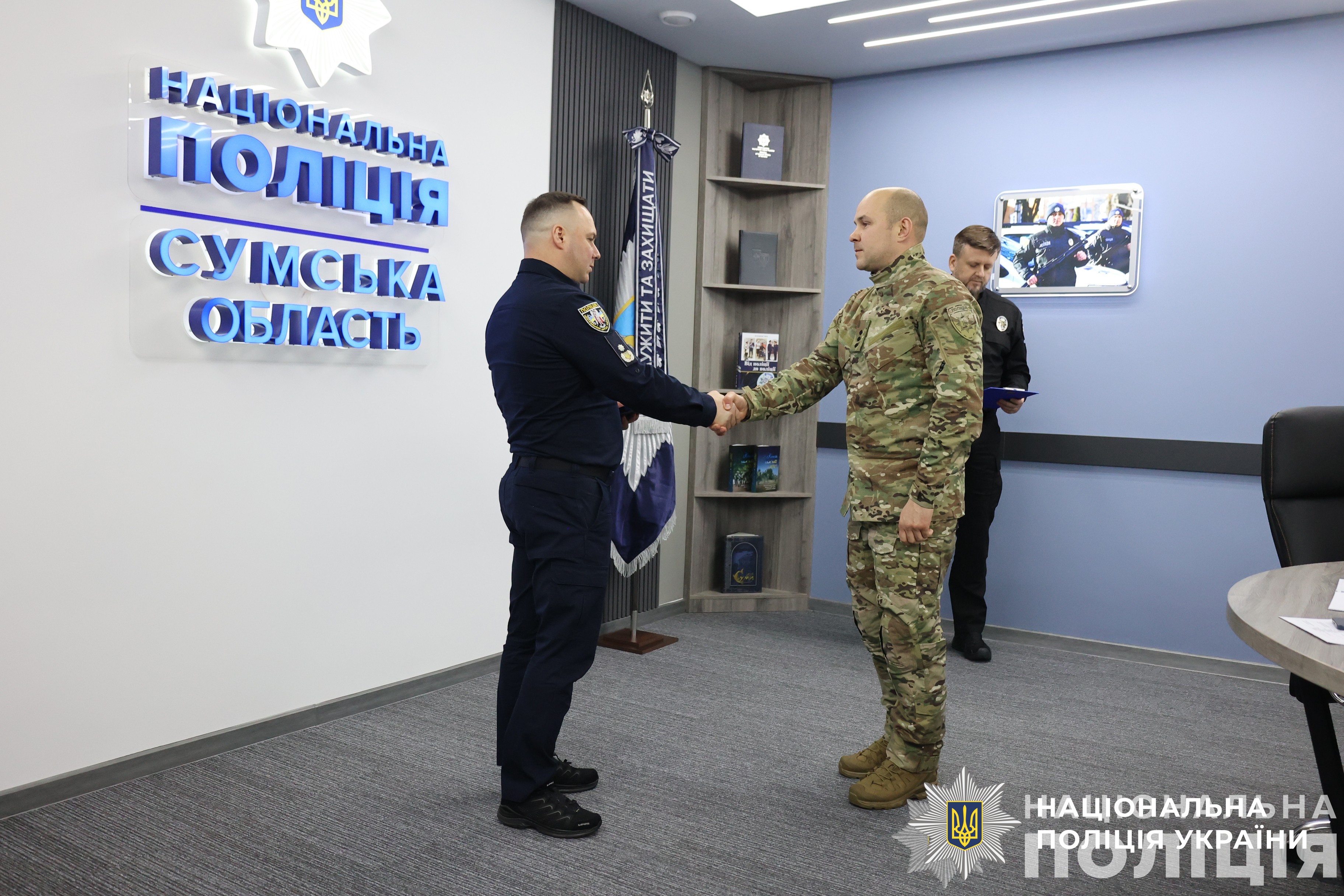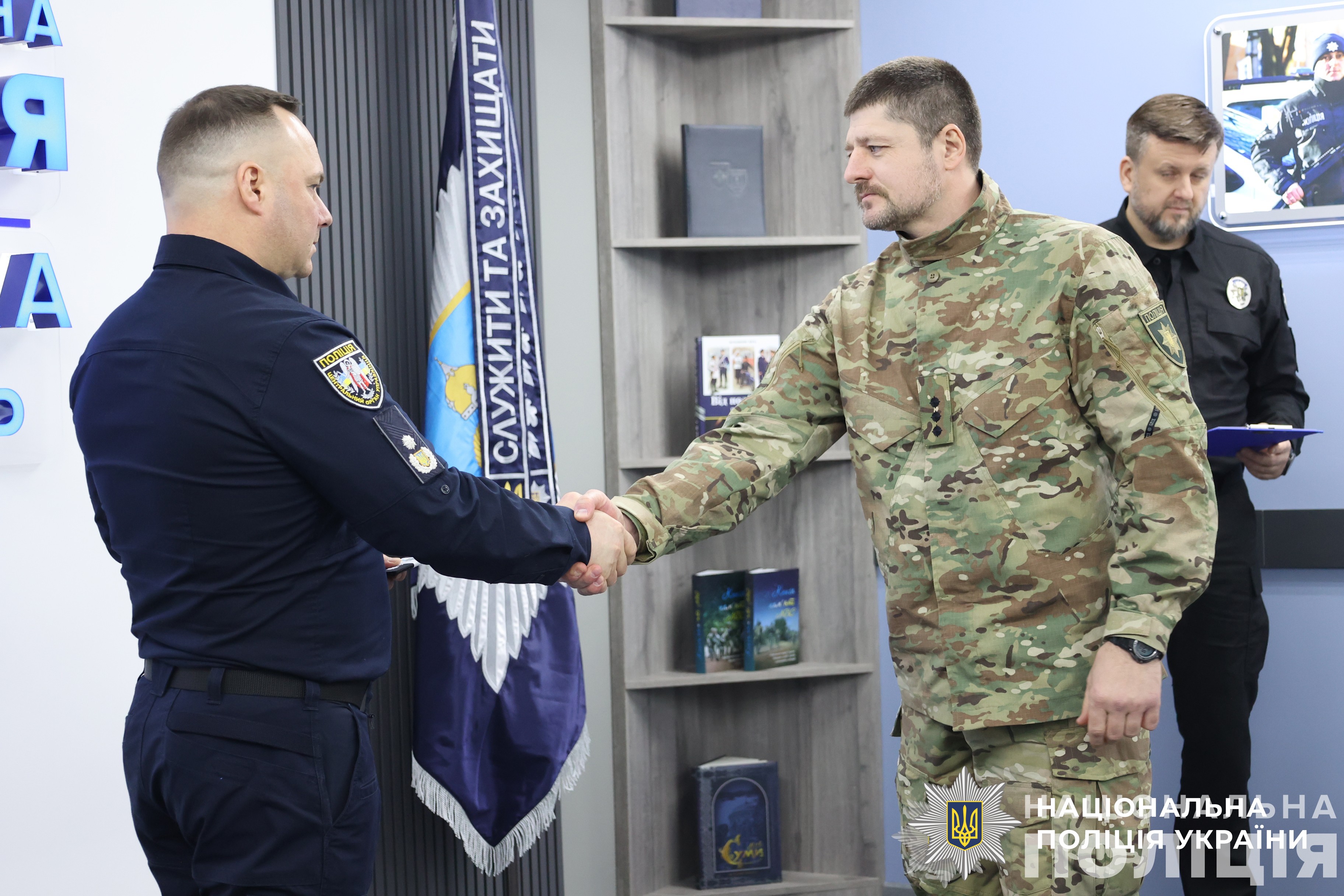 Очільник відомства провів оперативну нараду з керівниками структурних підрозділів ГУНП в Сумській області, заохотив спеціальними званнями та відзнаками кращих співробітників та оглянув умови дислокації відділів і управління поліції. А також відвідав та вручив відомчу відзнаку пораненому воїну штурмової бригади Нацполіції «Лють», який проходить лікування у медичному закладі МВС Сумщини.
