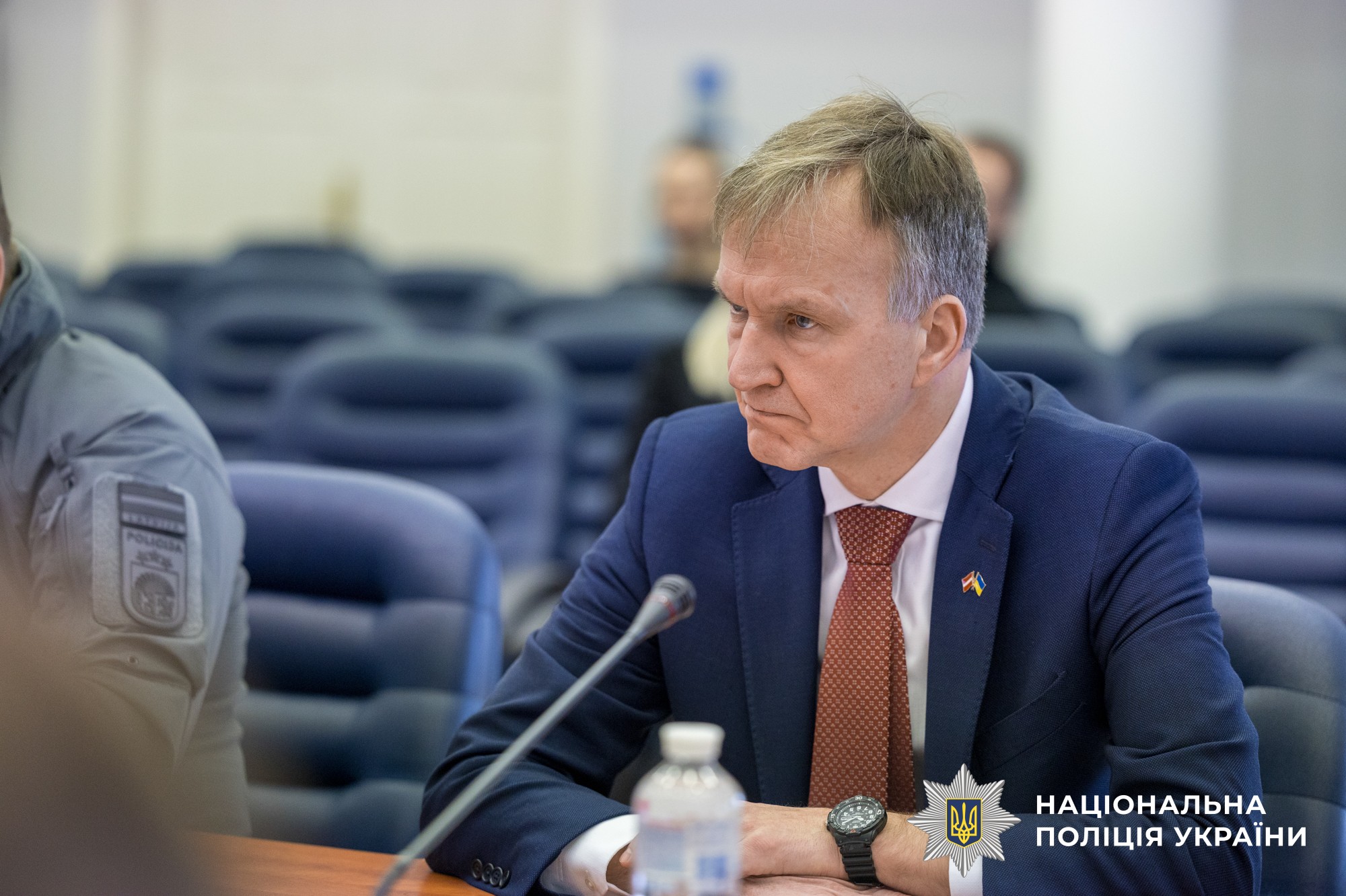 Слова підтримки висловив і Надзвичайний і Повноважний Посол Латвійської Республіки в Україні Андрейс Пілдеговічс. Він зазначив, не дивлячись на війну, робота Посольства розширюється, зокрема з’явилися експерти з воєнної індустрії, з питань економічної співпраці. Крім того, він подякував українським поліцейським за успішну співпрацю у напрямку організованої злочинності, викритті інтернет-шахрайств.