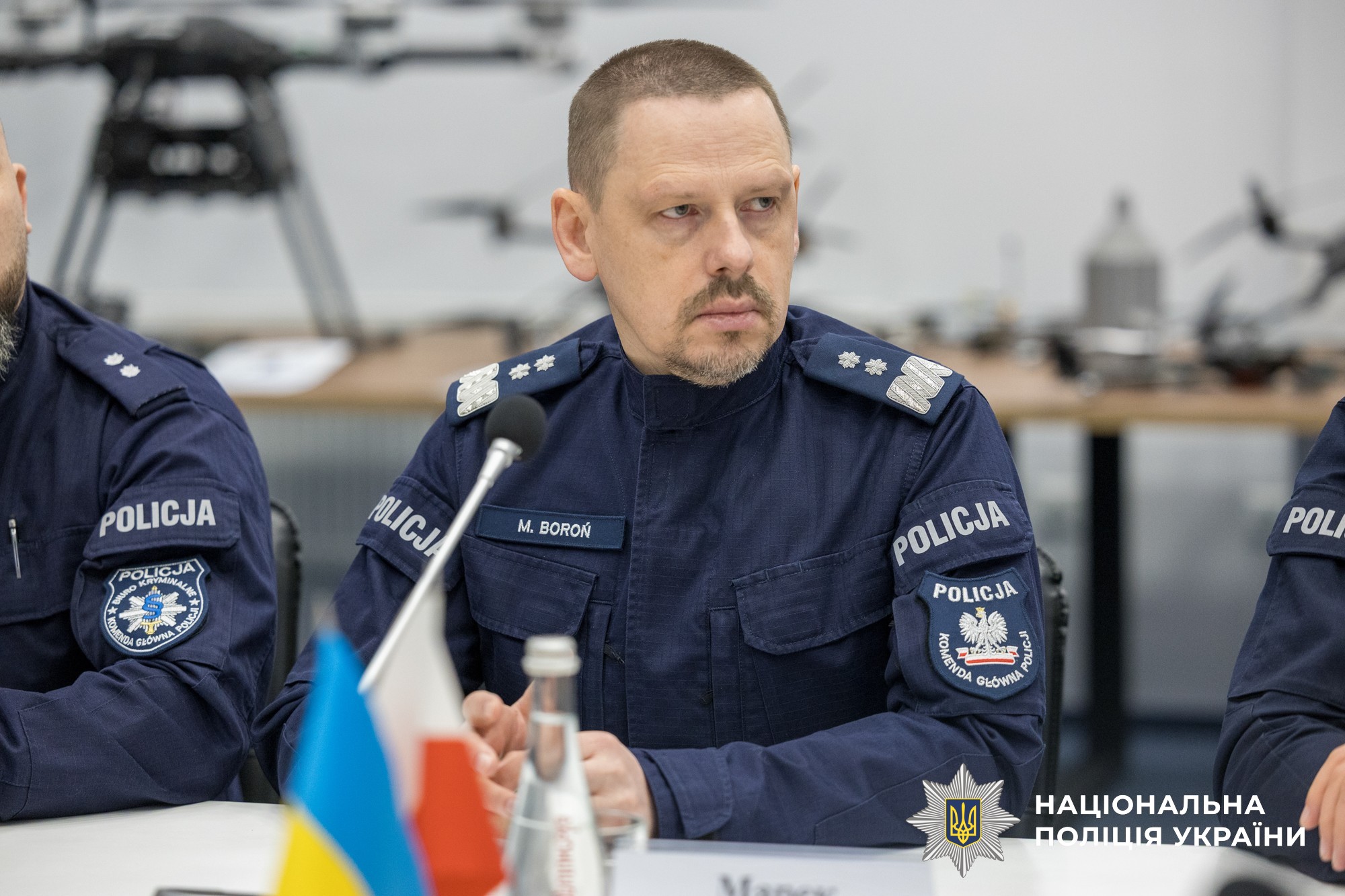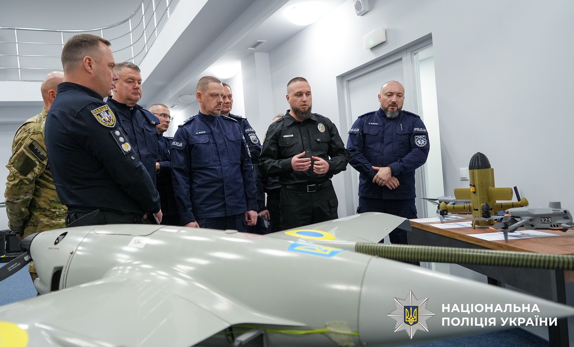 Під час зустрічі польські колеги ознайомилися з безпілотною технікою, що перебуває на озброєнні Нацполіції. Сергій Кравченко представив розвідувальні та ударні БпЛА, зокрема FPV-бомбери літакового типу.