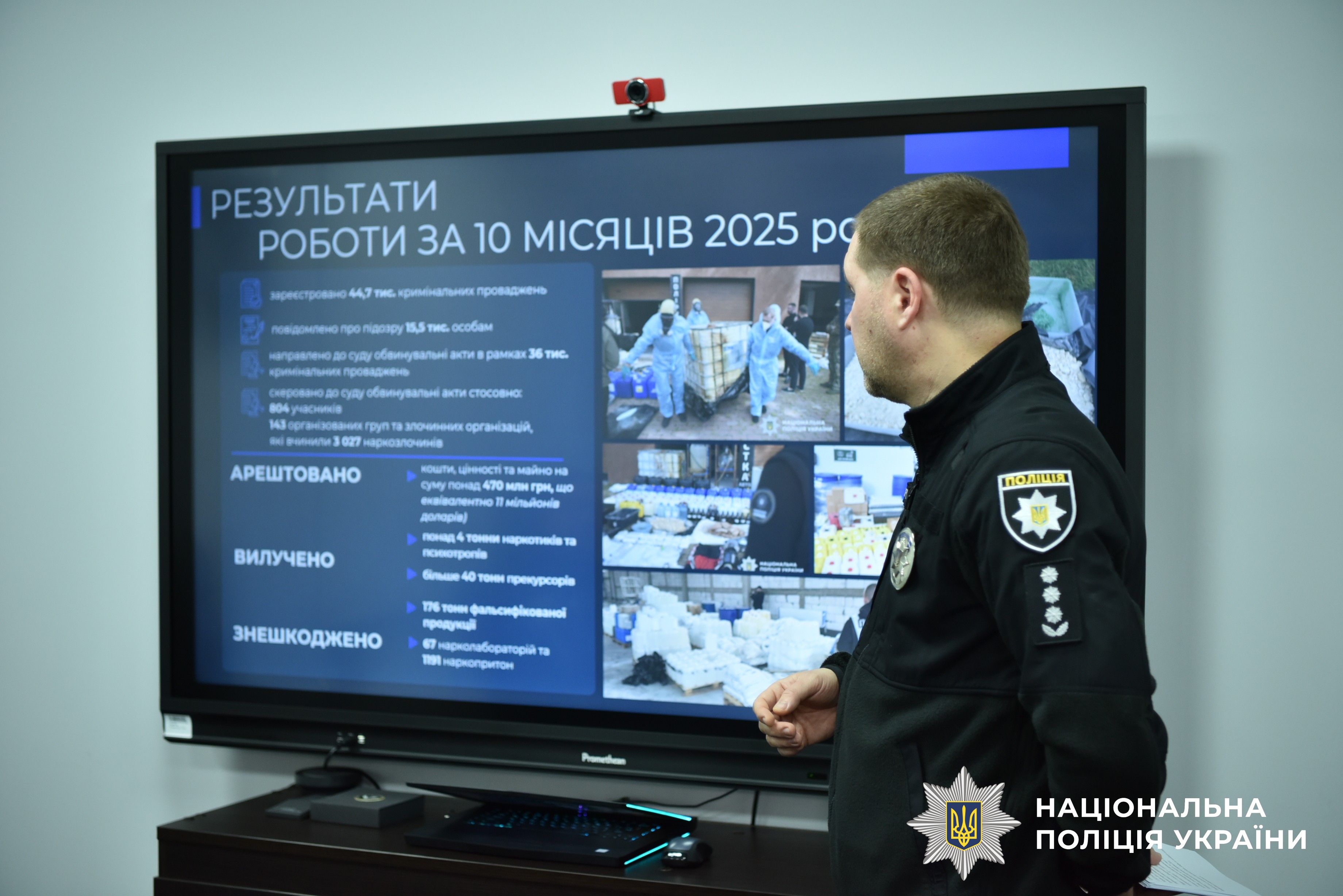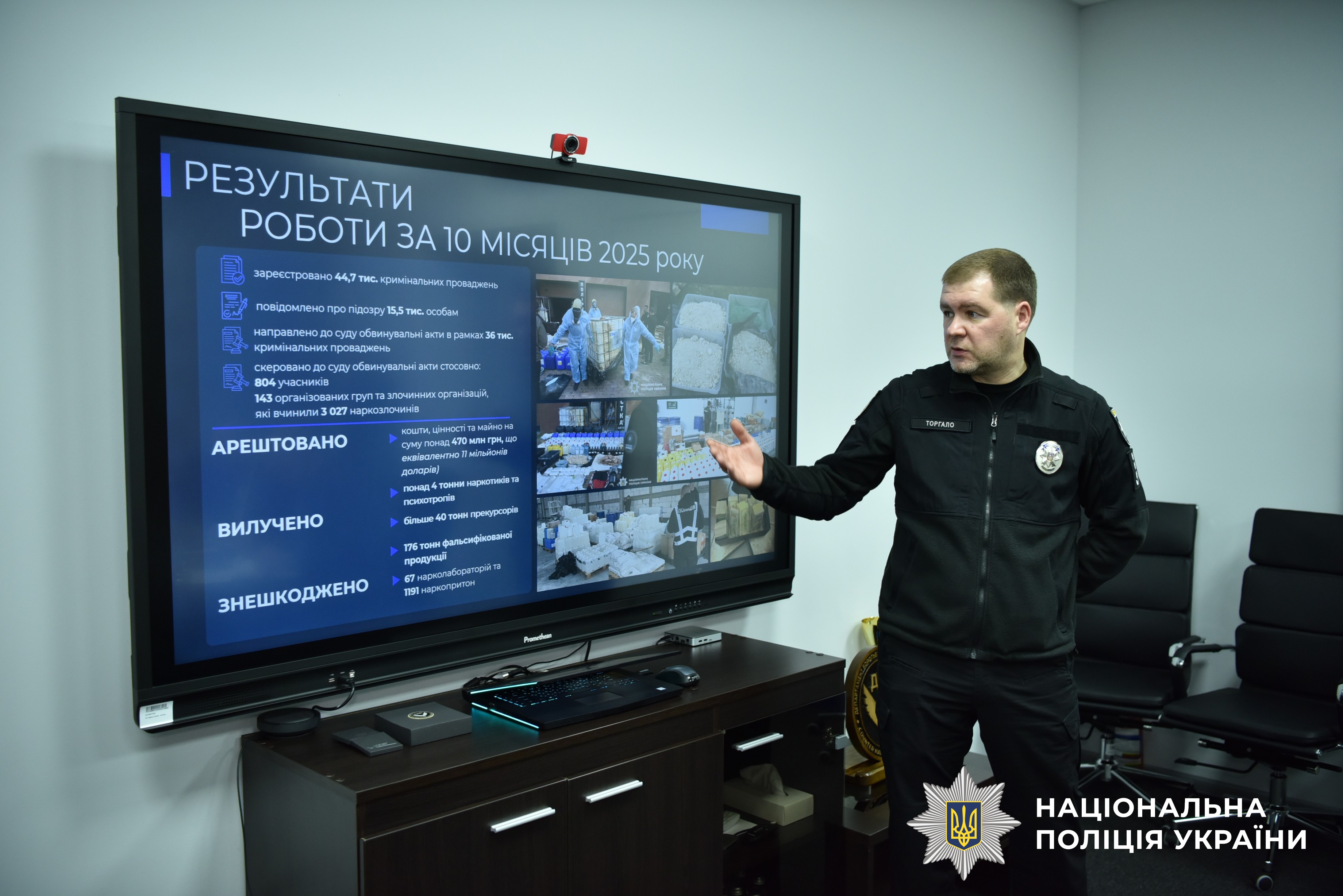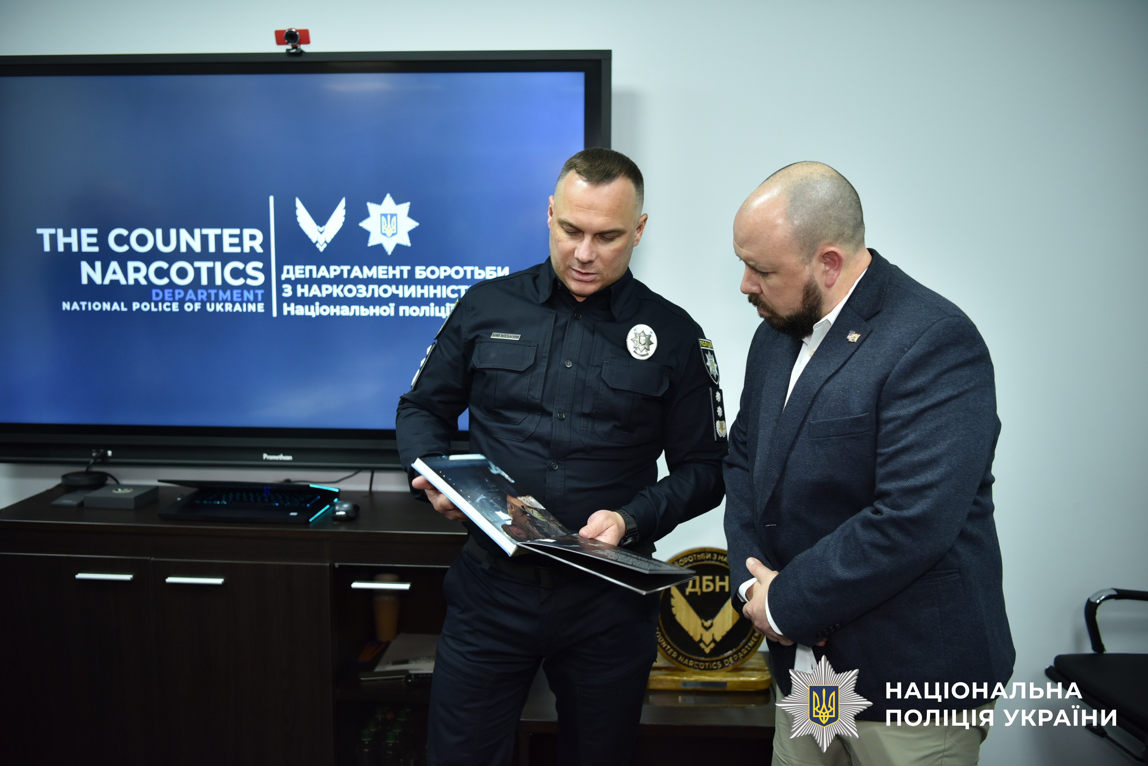 Своєю чергою, начальник Департаменту боротьби з наркозлочинністю провів розгорнуту інтерактивну презентацію щодо поточного стану боротьби з незаконним обігом наркотиків в Україні. Особливу увагу приділили ключовим напрямкам діяльності підрозділу: протидії організованим формам наркозлочинності, ліквідації лабораторій та мереж розповсюдження наркотиків, а також запобіганню легалізації коштів, отриманих від наркобізнесу.