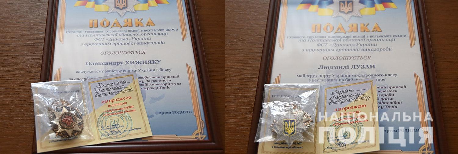 За високі спортивні досягнення Артем Родигін вручив подяку поліції Полтавської області та ФСТ «Динамо» України, грошову винагороду, а також відзнаку поліції Полтавської області - нагрудний знак «Знак Пошани» майстру спорту України міжнародного класу з веслування на байдарках і каное Людмилі Лузан та заслуженому майстру спорту України з боксу Олександру Хижняку.