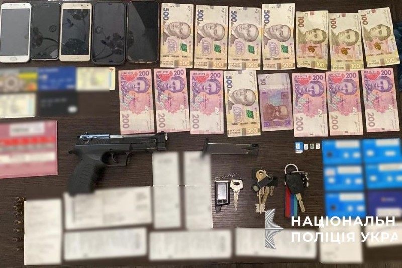 Під час санкціонованих судом обшуків за місцем проживання фігурантів, а також в приміщенні, яке останні використовували у злочинній діяльності, поліцейські вилучили майже два десятки мобільних телефонів, понад 20 банківських карток, ноутбуки, сім-карти, флеш-накопичувачі, грошові кошти, а також предмет, зовні схожий на пістолет та набої.