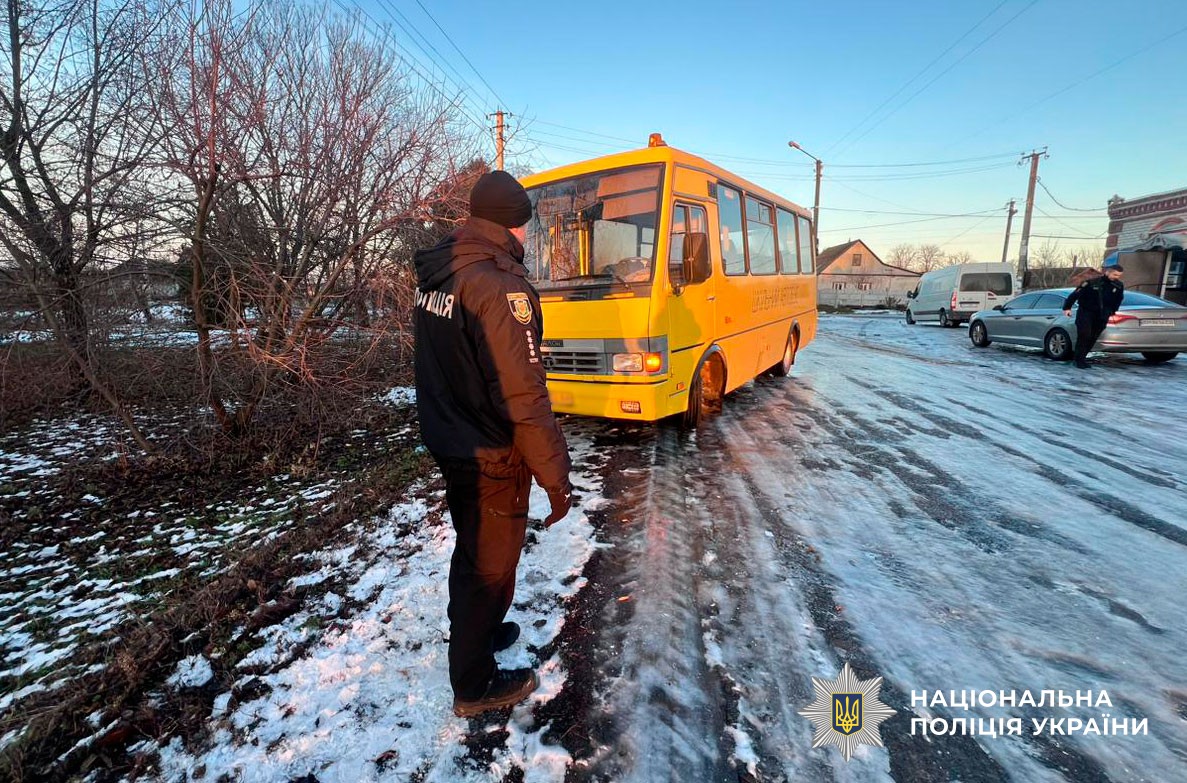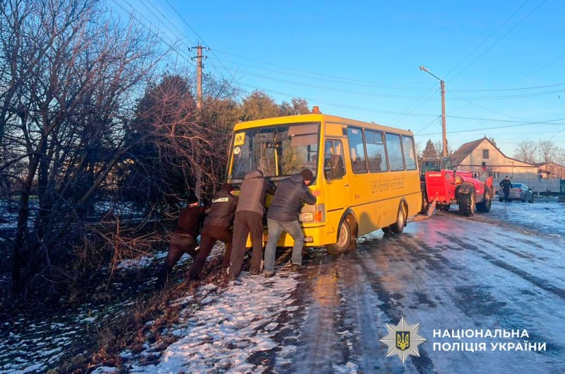 Автобус забуксував на заледенілому узбіччі та не зміг самостійно виїхати на проїзну частину. На допомогу прийшли очевидці події, з-поміж яких були й працівники поліції. Об’єднавши зусилля, рятівники виштовхали автобус на дорогу.