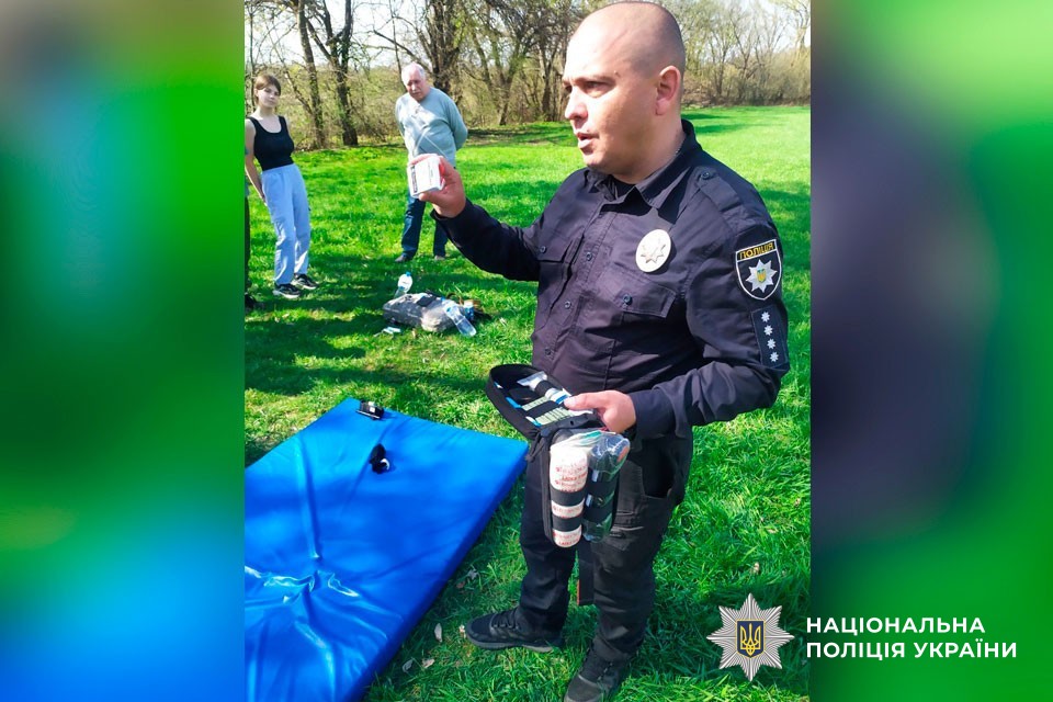 Капітан поліції роз’яснив дітям, як в екстремальних ситуаціях зупинити кровотечу, правильно накласти турнікет чи пов'язку, а також розповів алгоритм дій до прибуття медиків.