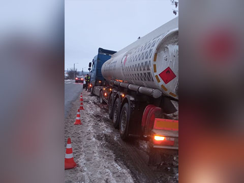 Як повідомив Євгеній Сліпченко, начальник відділення поліції №3 (с-ще Нові Санжари), під колесами вантажівки розтанув сніг і вона не змогла рушити з узбіччя. Спільними зусиллями, рятувальним та поліцейським вдалося швидко витягти вантажівку на дорогу.