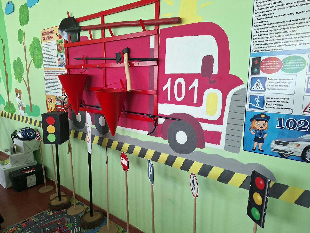 Клас безпеки навчального закладу поділений на тематичні зони. Тут є необхідна інформація, демонстраційні матеріали, реквізит для вивчення Правил дорожнього руху, мінної та пожежної безпеки, медицини та вивчення інших правил безпеки для школярів різного віку.