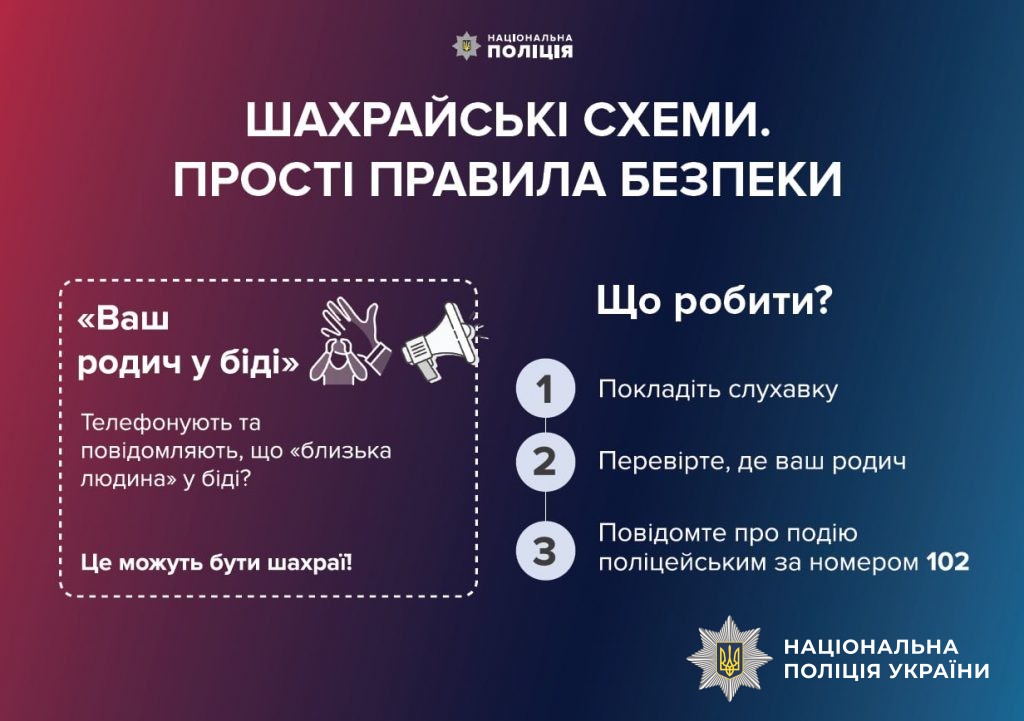 - якщо вам телефонують або надходять повідомлення у месенджерах чи соціальних мережах від друзів, чи рідних із проханням терміново перерахувати їм кошти (на лікування, в борг і таке інше) – за жодних обставин не перераховуйте кошти та не переходьте за іншими посиланнями, які вам пропонують зловмисники. Спробуйте якнайшвидше особисто зв’язатися з тим родичем чи знайомим, хто нібито потребує негайної грошової допомоги, щоб підтвердити чи спростувати надіслану інформацію;