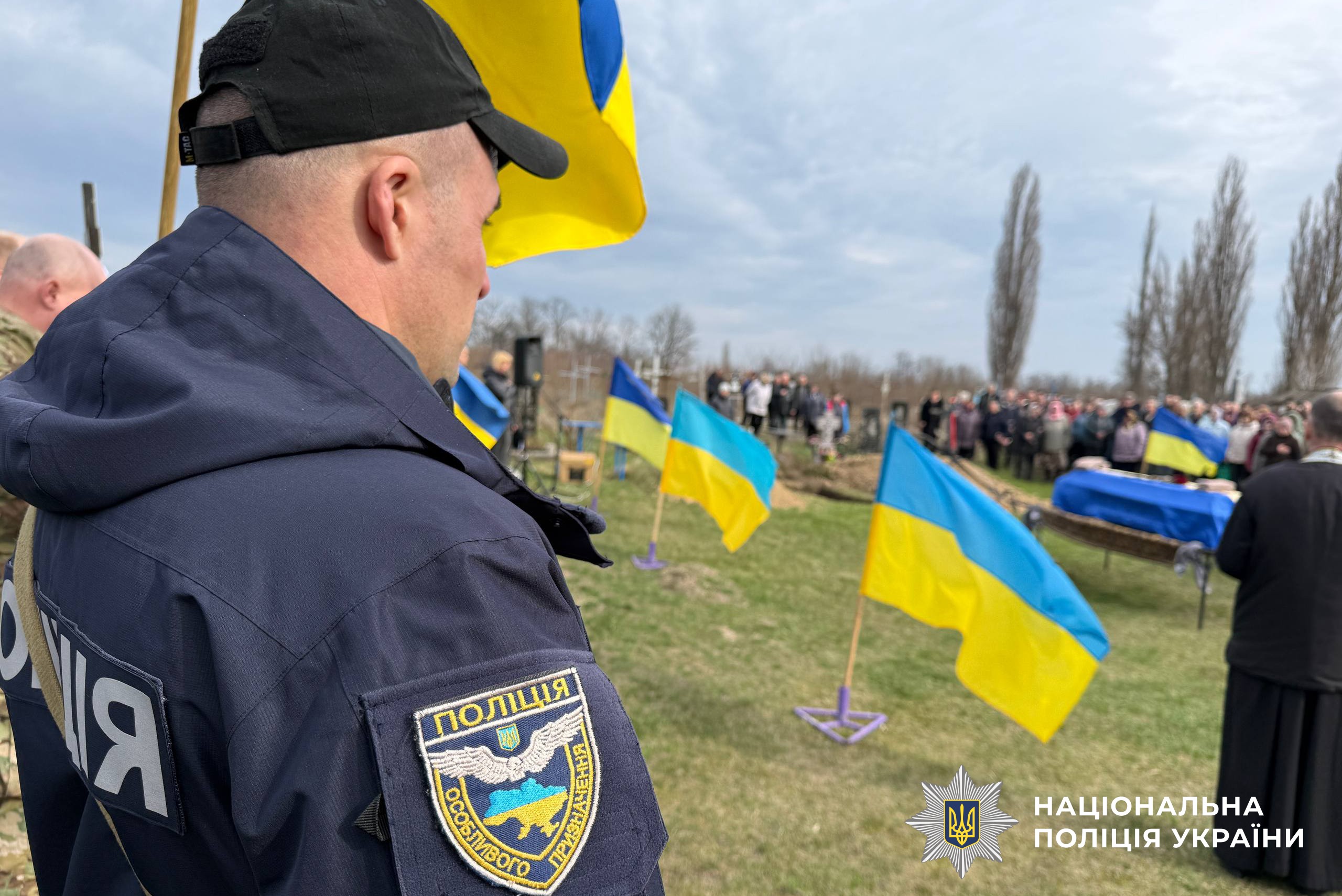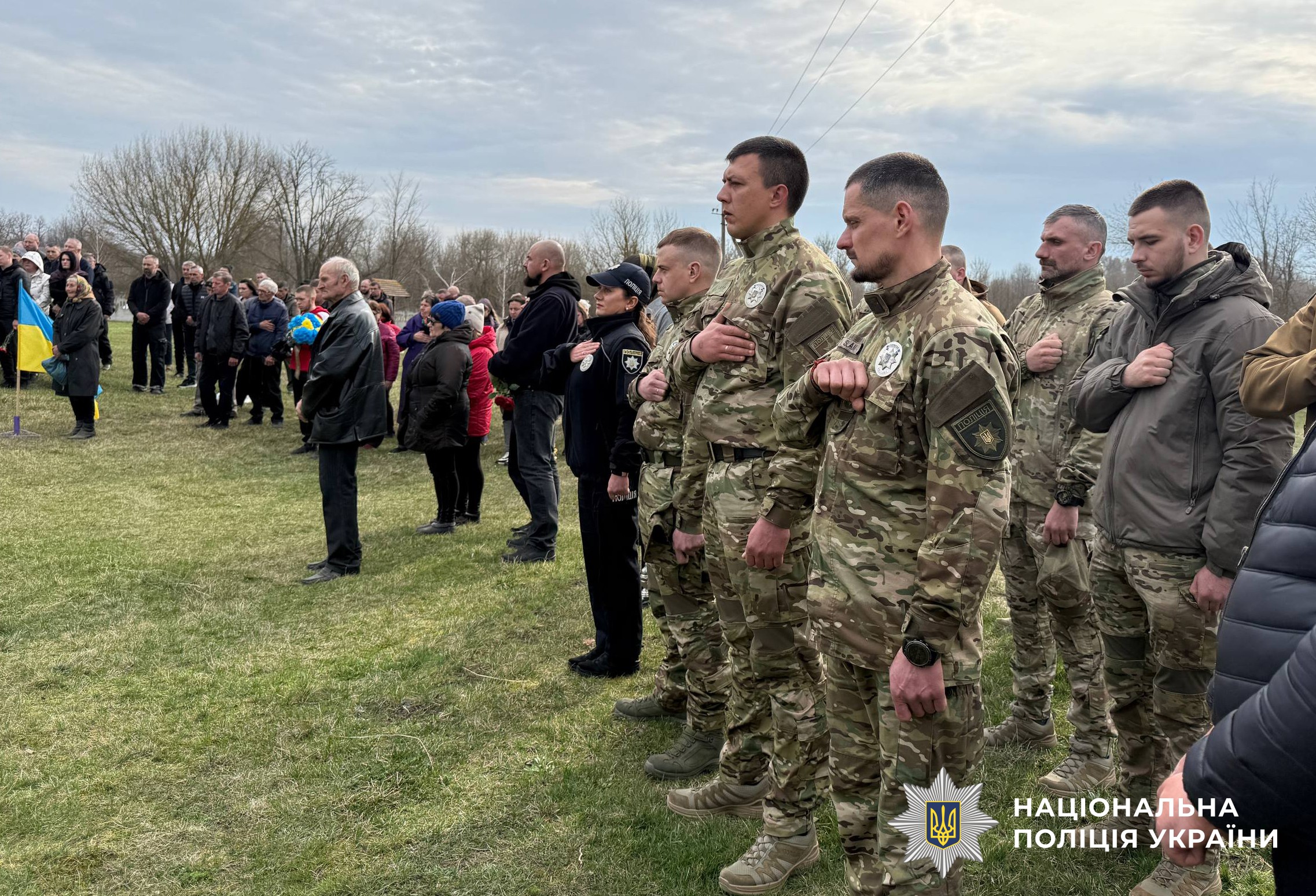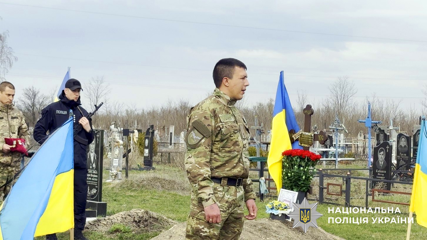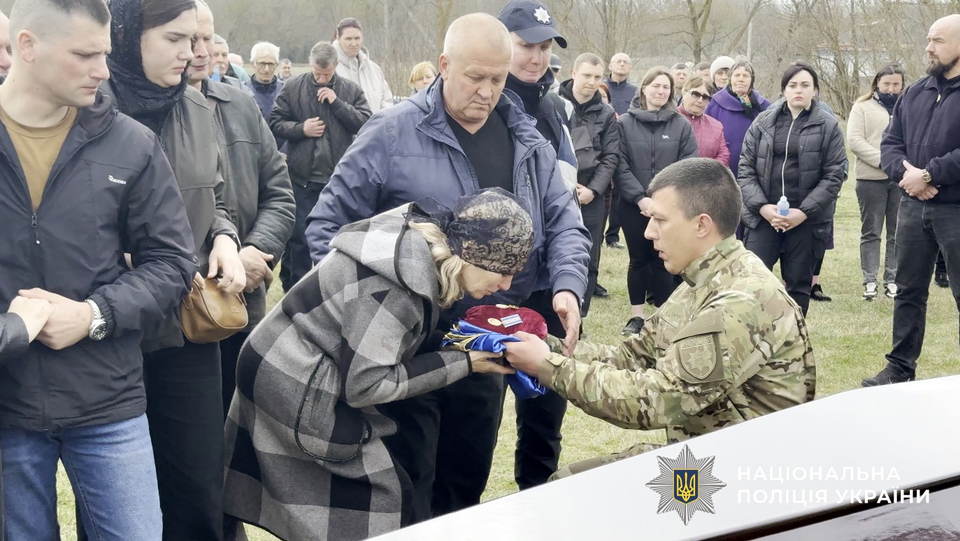 Прощальна церемонія зібрала сотні людей. Живий коридор шани утворили колеги-поліцейські, бойові побратими, друзі та односельці.