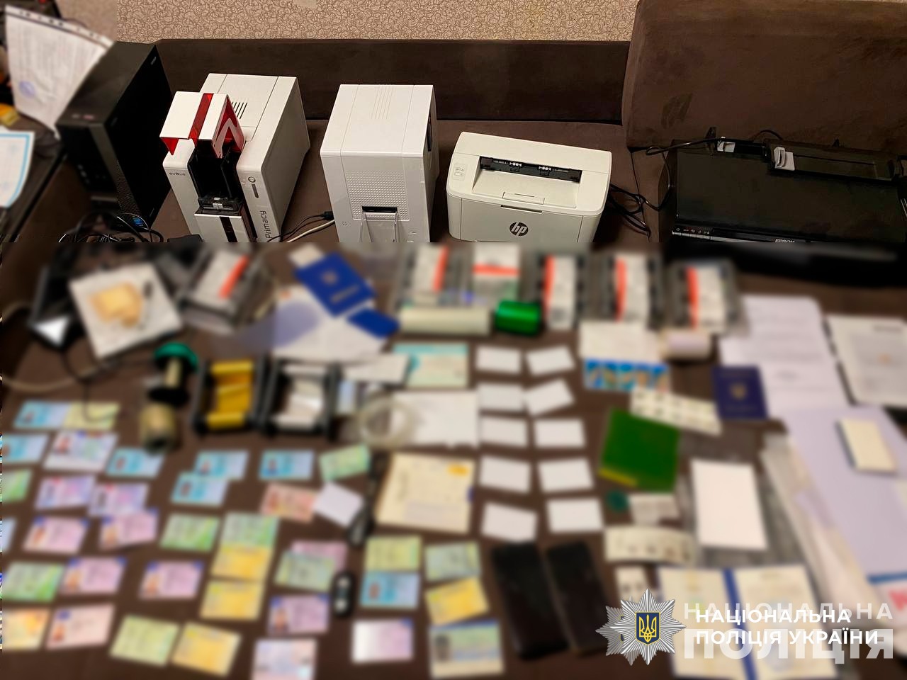 Слідчі Нацполіції за оперативного супроводу Департаменту карного розшуку провели 35 обшуків на території Київської, Вінницької, Волинської, Дніпропетровської, Житомирської, Одеської, Полтавської, Миколаївської та Хмельницької областей, в ході яких виявили та вилучили підроблені паспорти різних країн, військові квитки, водійські посвідчення та інші документи, а також техніку для їх виготовлення.