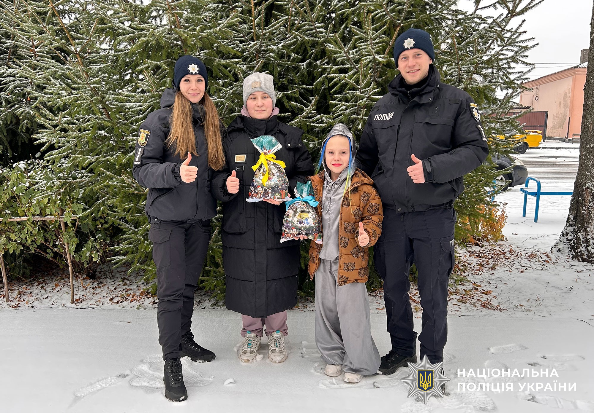Очільниця сектору ювенальної превенції Яніна Захода та начальник сектору взаємодії з громадами Павло Лубенець передали дітям смаколики та іграшки.
