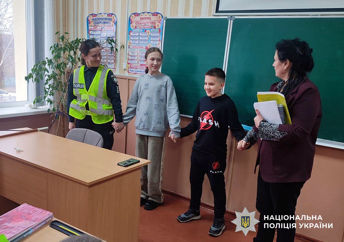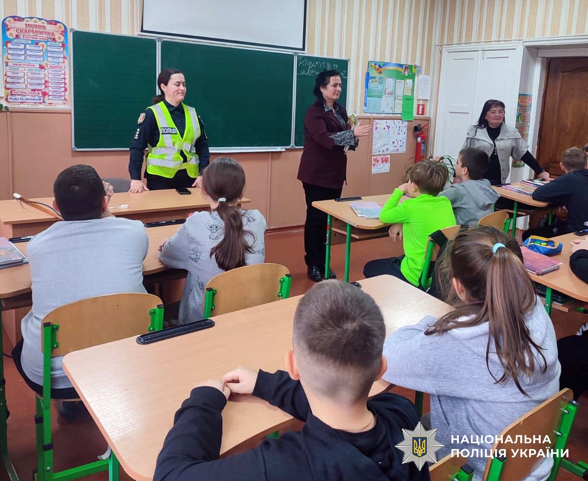 Поліцейська роз’яснила учням 5 та 6 класів правила дорожнього руху та нагадала про важливість використання світловідбивальних елементів у темну пору доби. Також згадали значення дорожніх знаків та правила для пішоходів.