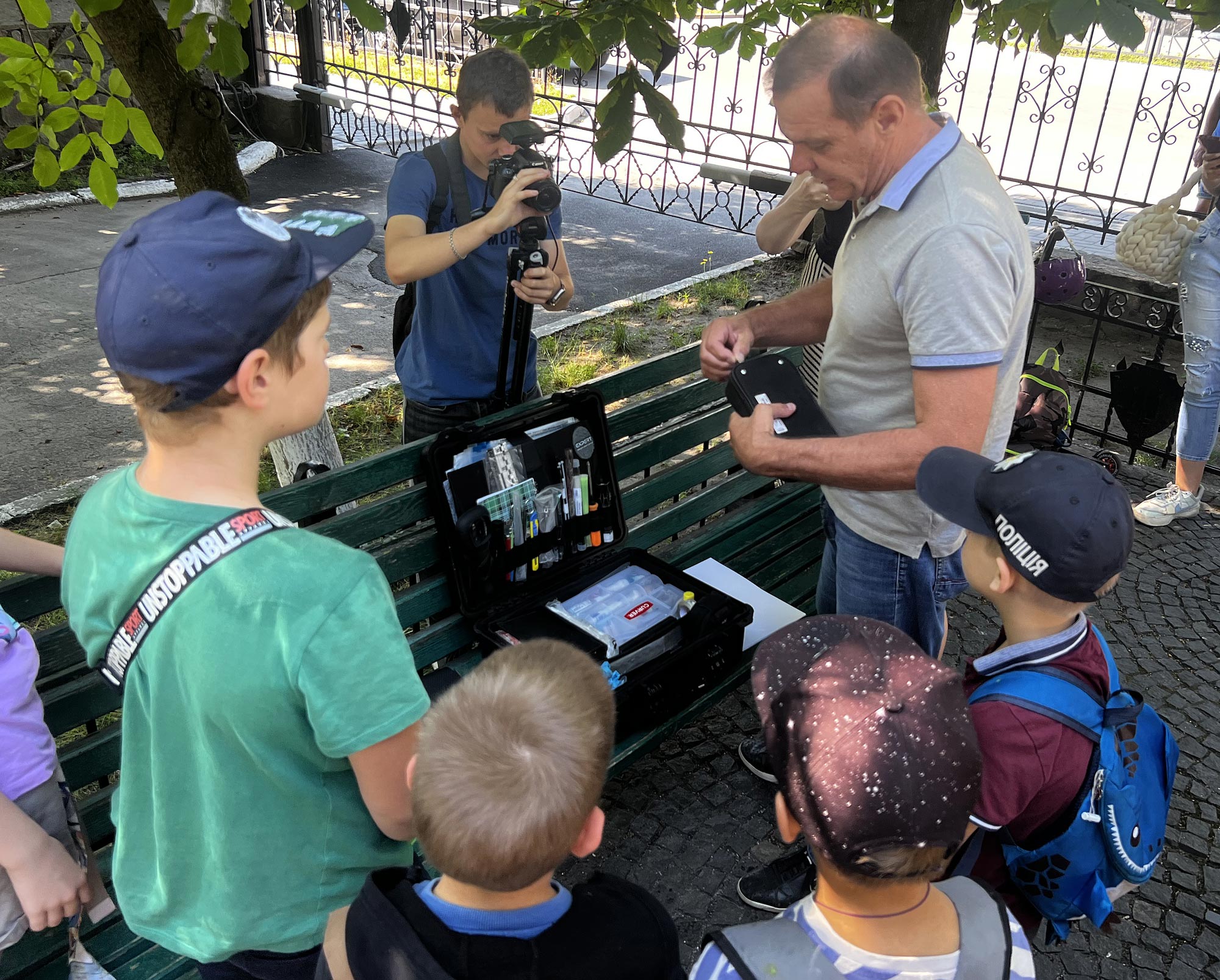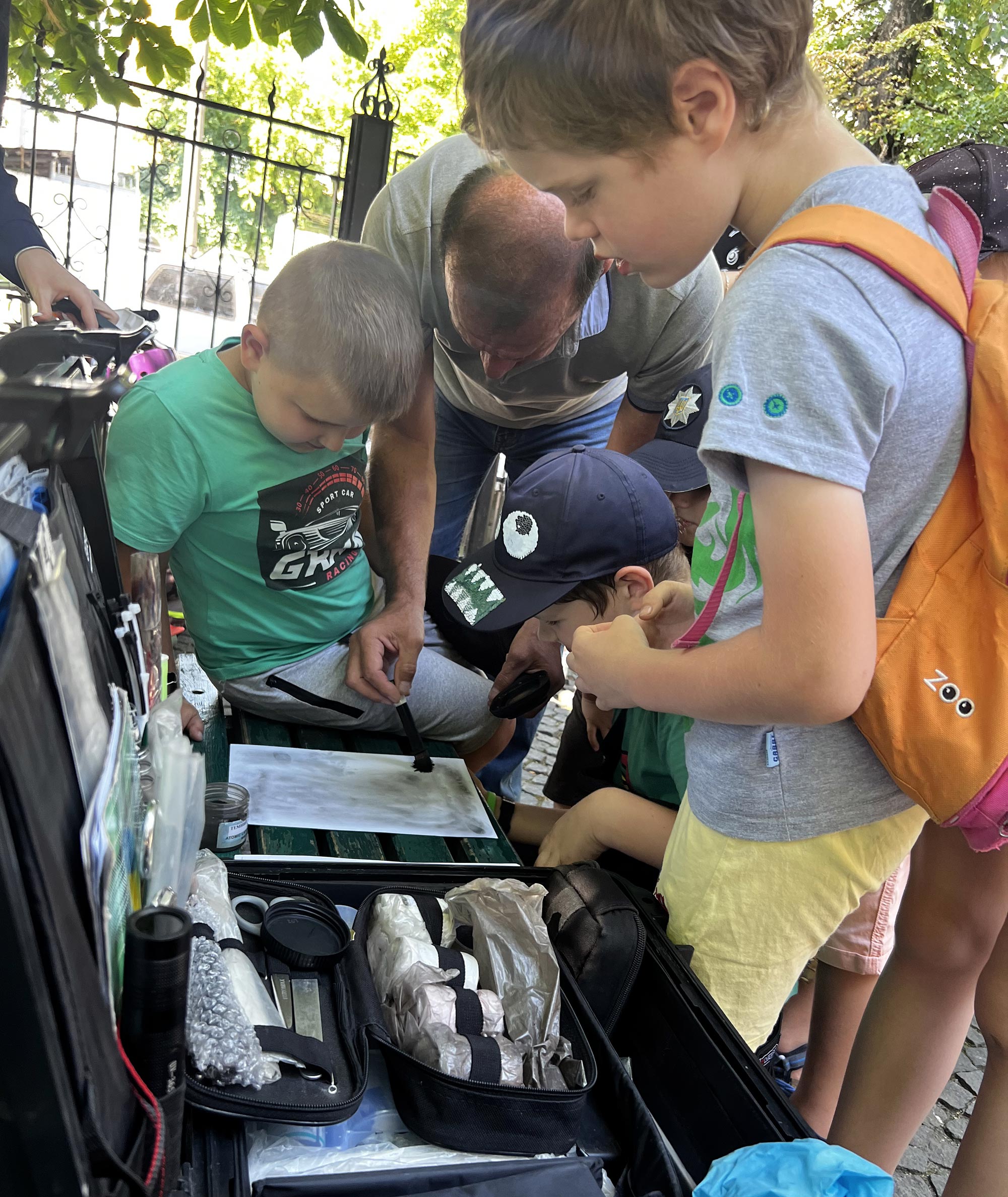Правоохоронці продемонстрували юним гостям вміст криміналістичної валізи за допомогою якої проводяться слідчі дії. Своєю чергою діти спробували себе в ролі експерта криміналіста, а саме вчилися вилучати відбитки пальців з різних предметів.