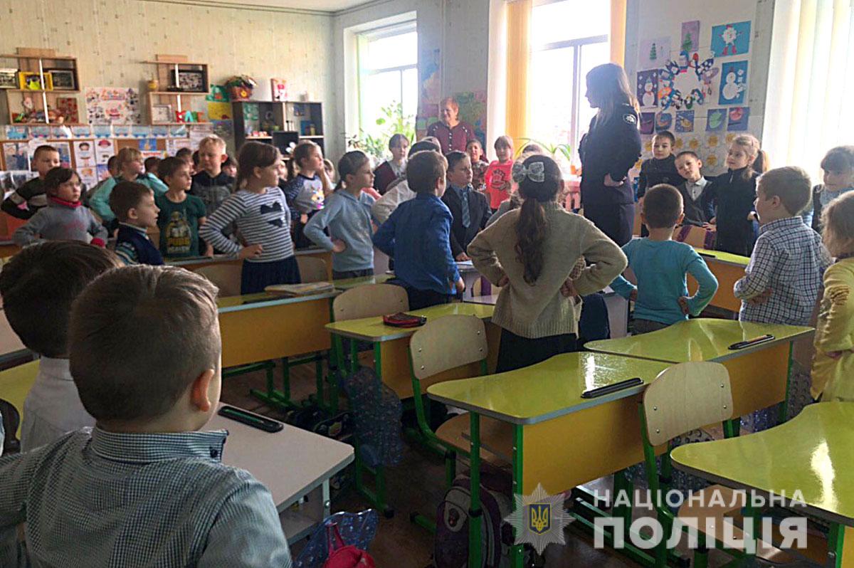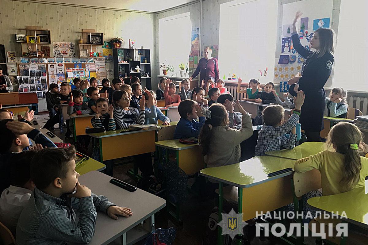 Окремо поліцейська зустрілася із учнями початкових класів та поговорила з дітьми про безпеку на дорогах. Діти пригадали Правила для пішоходів та у ігровій формі закріпили вивчений матеріал.