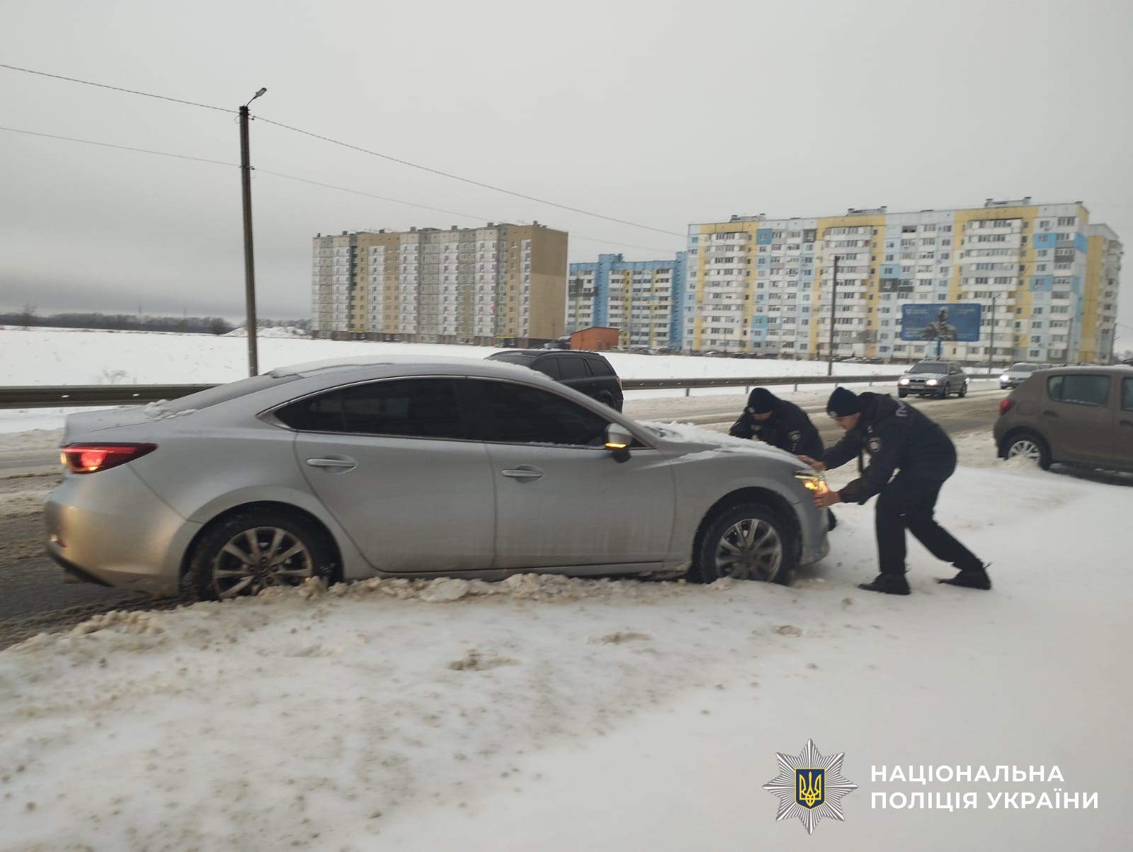 Працівники відділу поліції №2 Полтавського районного управління та поліцейський офіцер Щербанівської громади допомогли водіям легкових автомобілів вибратись із засніжених ділянок дороги та узбіччя.