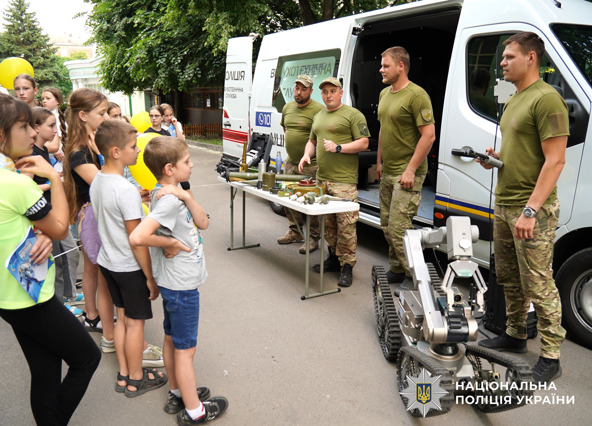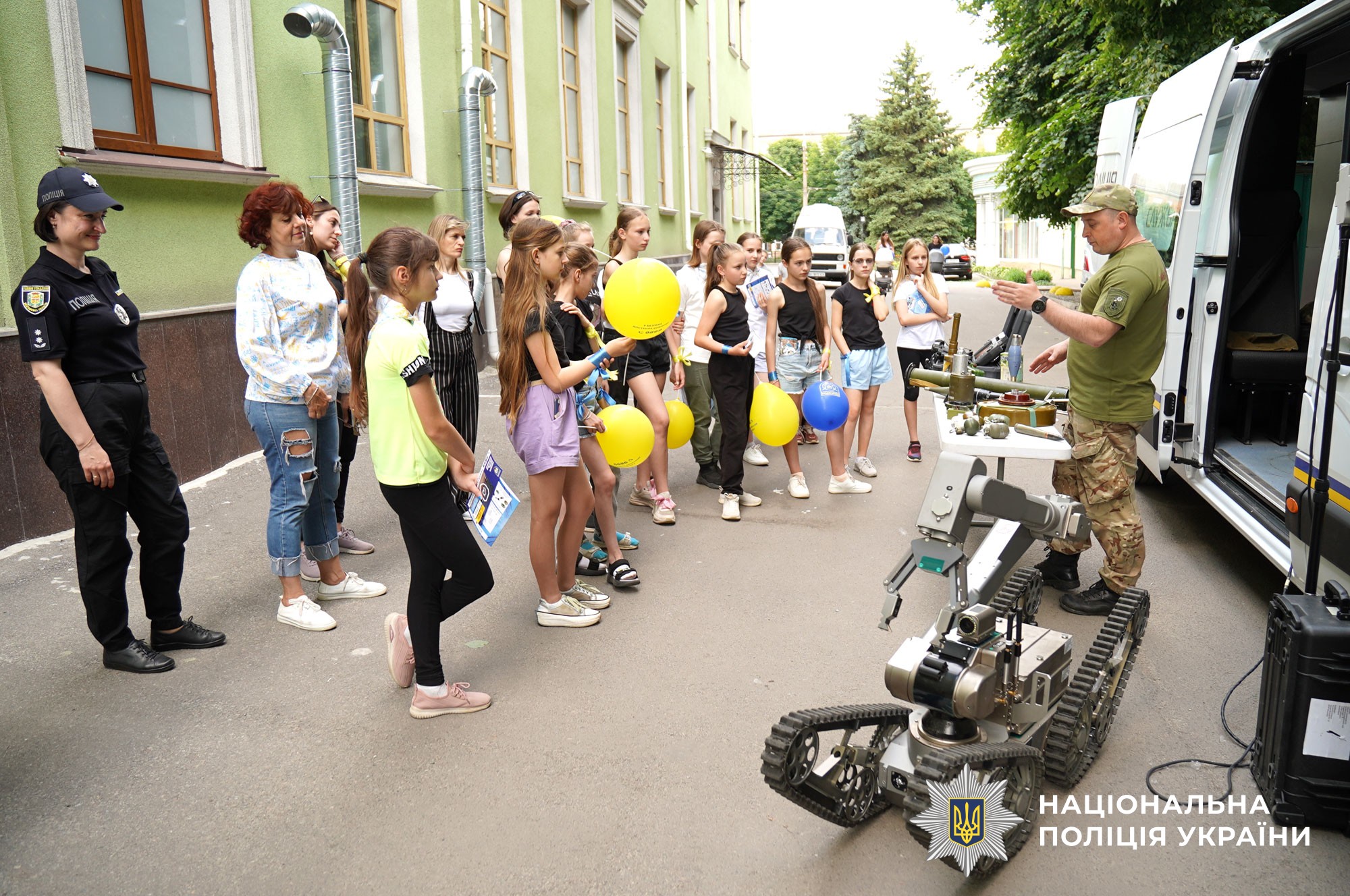 Начальник відділу вибухотехнічної служби обласної поліції Артем Бондаренко разом зі своїми колегами продемонстрували дітям макети вибухонебезпечних предметів, а також презентували роботизований комплекс, який допомагає дистанційно вилучати небезпечні предмети та безпечно для оточуючих знищувати їх.