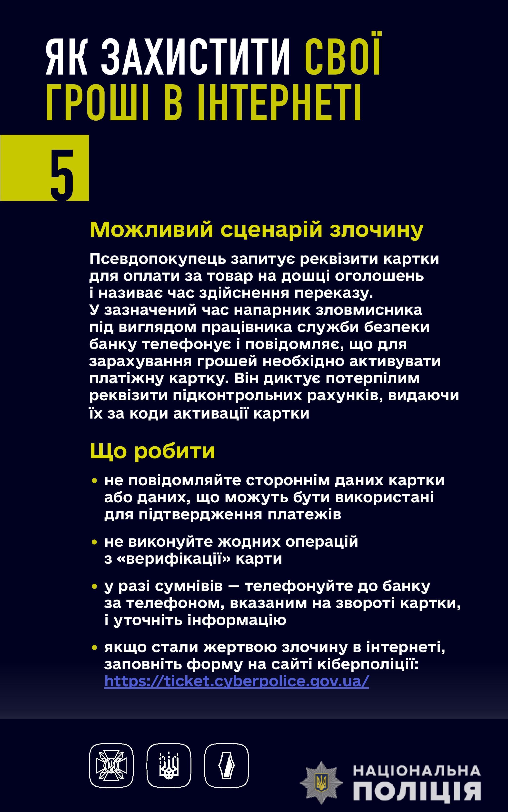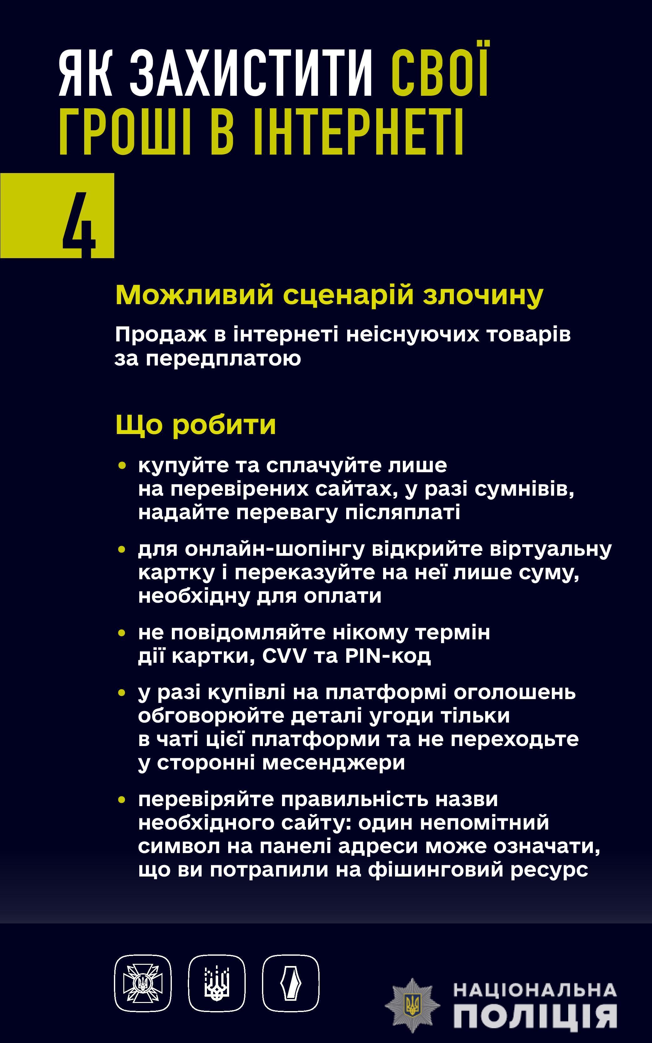 - не розголошувати персональні дані, дані банківських карт і купувати лише у перевірених магазинах.