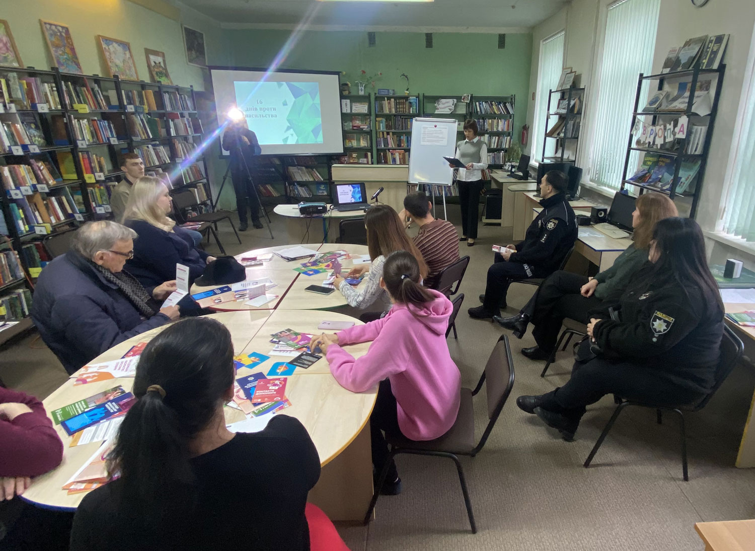 Зустріч відбулася 30 листопада у читацькій залі Кременчуцької міської публічної бібліотеки. У заході взяли участь працівники сектору протидії домашньому насильству Кременчуцького райуправління поліції, спеціалісти Кременчуцького міського центру соціальних служб, фахівці безоплатної правової вторинної допомоги та всі бажаючі.