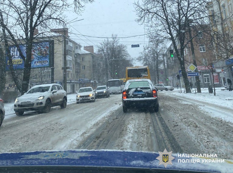 Поліція Полтавщини закликає водіїв та пішоходів бути обережними під час зимової негоди