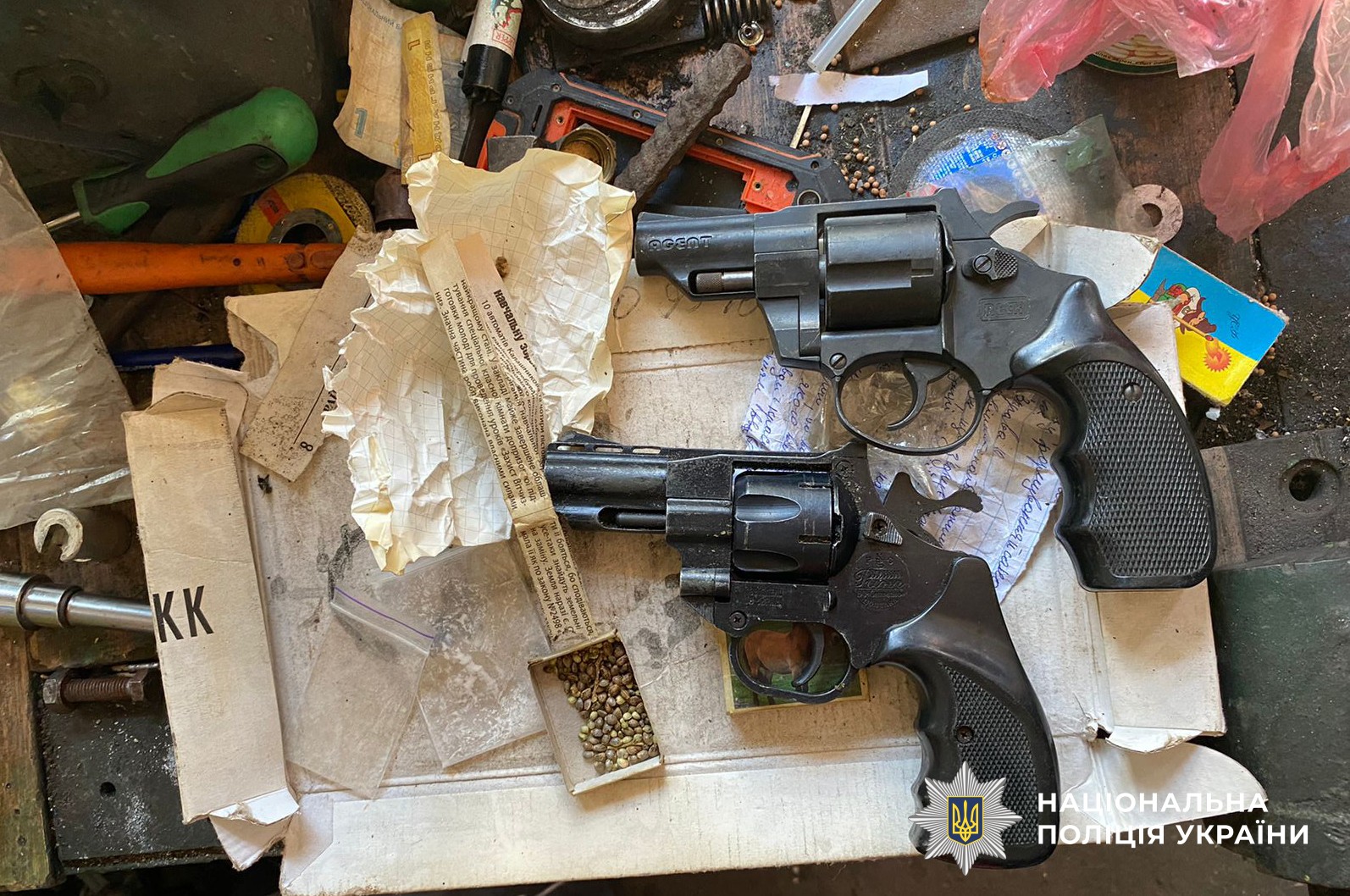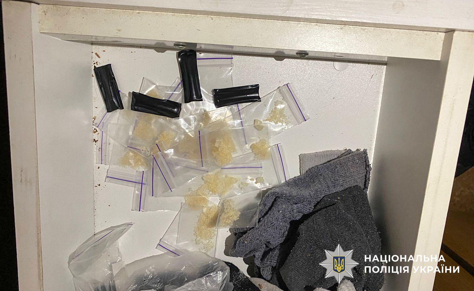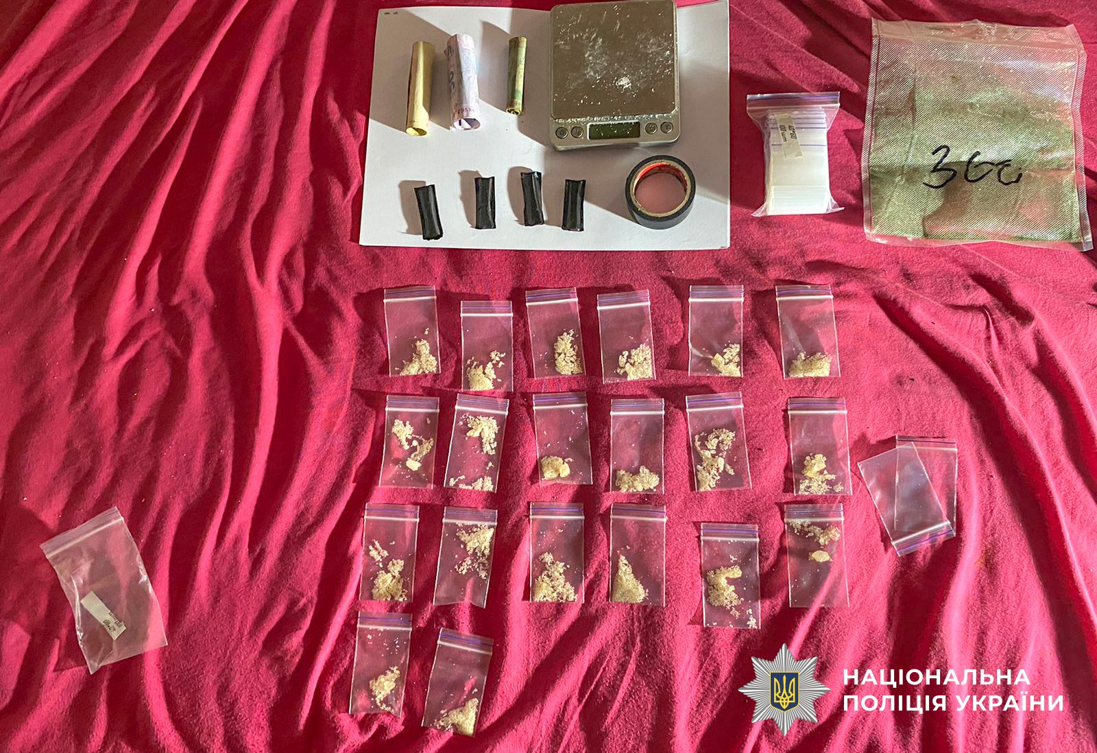 За інформацією начальника Управління боротьби з наркозлочинністю Геннадія Пархоменка, під час санкціонованих обшуків слідчі вилучили кілька десятків зіп-пакетів із солями «Альфа-PVP» загальною вагою близько пів кілограма, готові для поширення закладки, пакунок з амфетаміном, зіп-пакет з канабісом та два револьвери. Вилучені речові докази направили на судові експертизи.