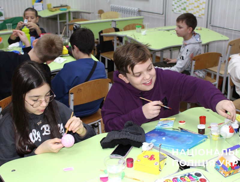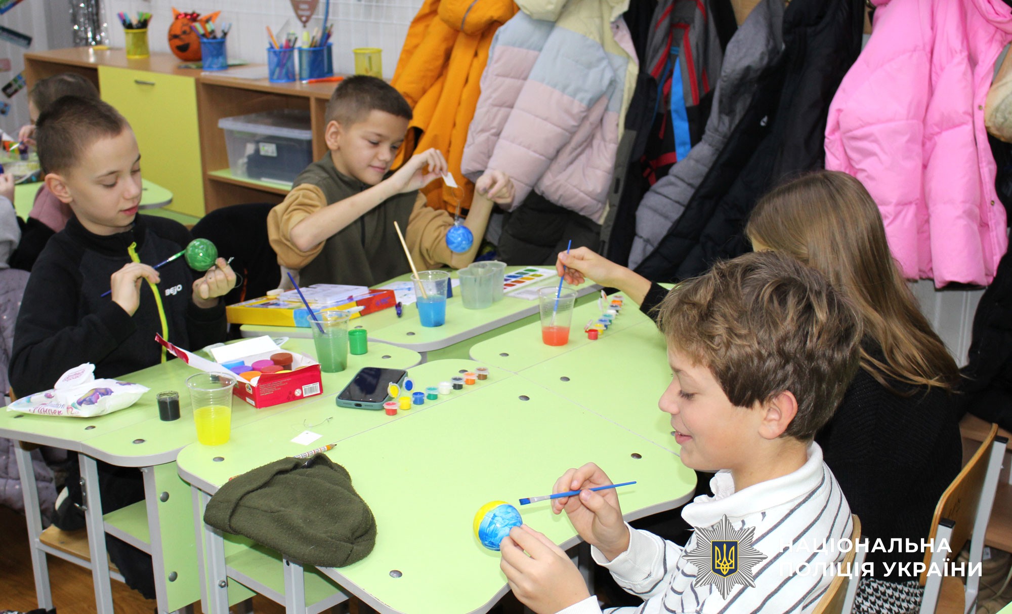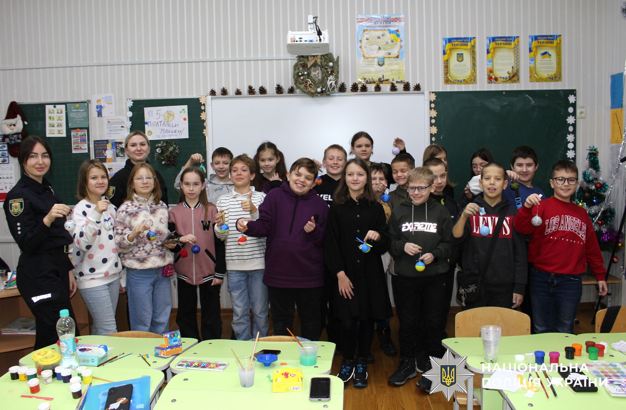 Поліцейські Полтави разом з дітьми розмалювали новорічні іграшки, а також підготували листівки з привітаннями для військових Збройних Сил України. Згодом волонтери доставлять дитячі подарунки бійцям на фронт.