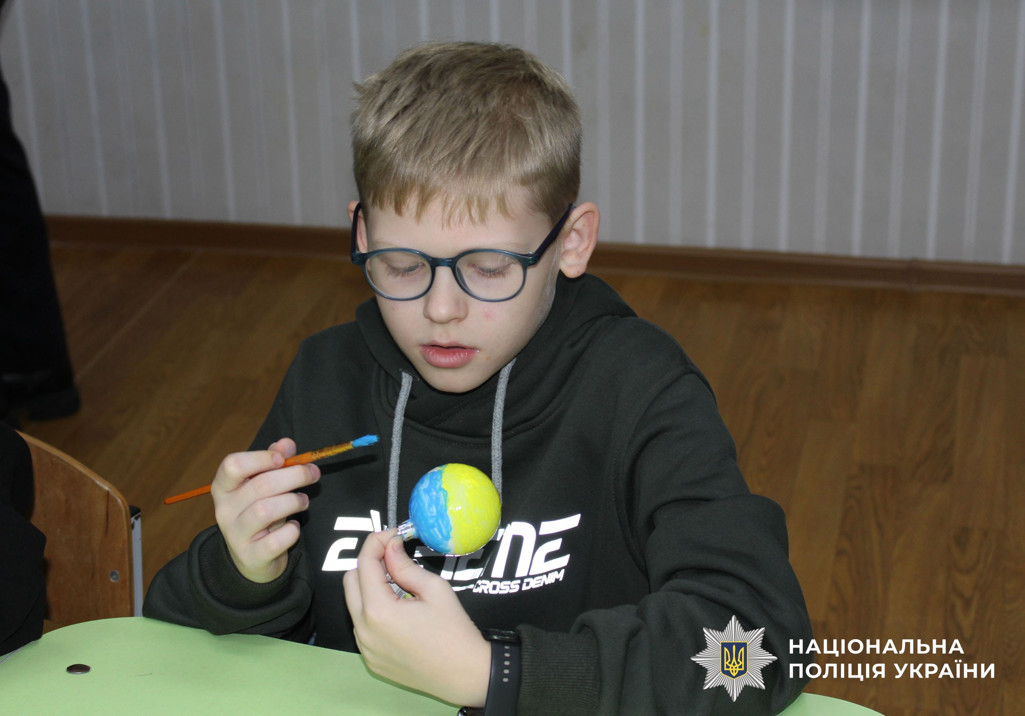 Друга частина зустрічі присвячена виготовленню новорічних оберегів для захисників. Діти та поліцейські разом розфарбували та оздобили новорічні іграшки, а також підготували вітальні листівки для воїнів, які боронять нашу країну. Згодом волонтери доставлять дитячі подарунки бійцям на фронт.