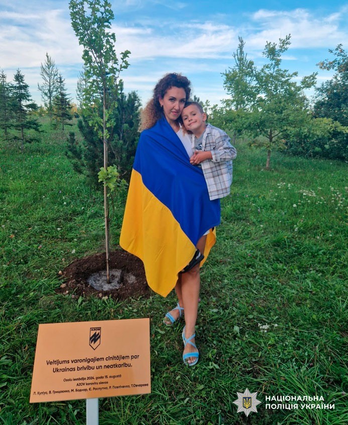 Полтавська поліцейська Вікторія Грицаєнко, дружина загиблого воїна, посадила дерево Шани захисникам незалежності України в латвійському Саду Долі