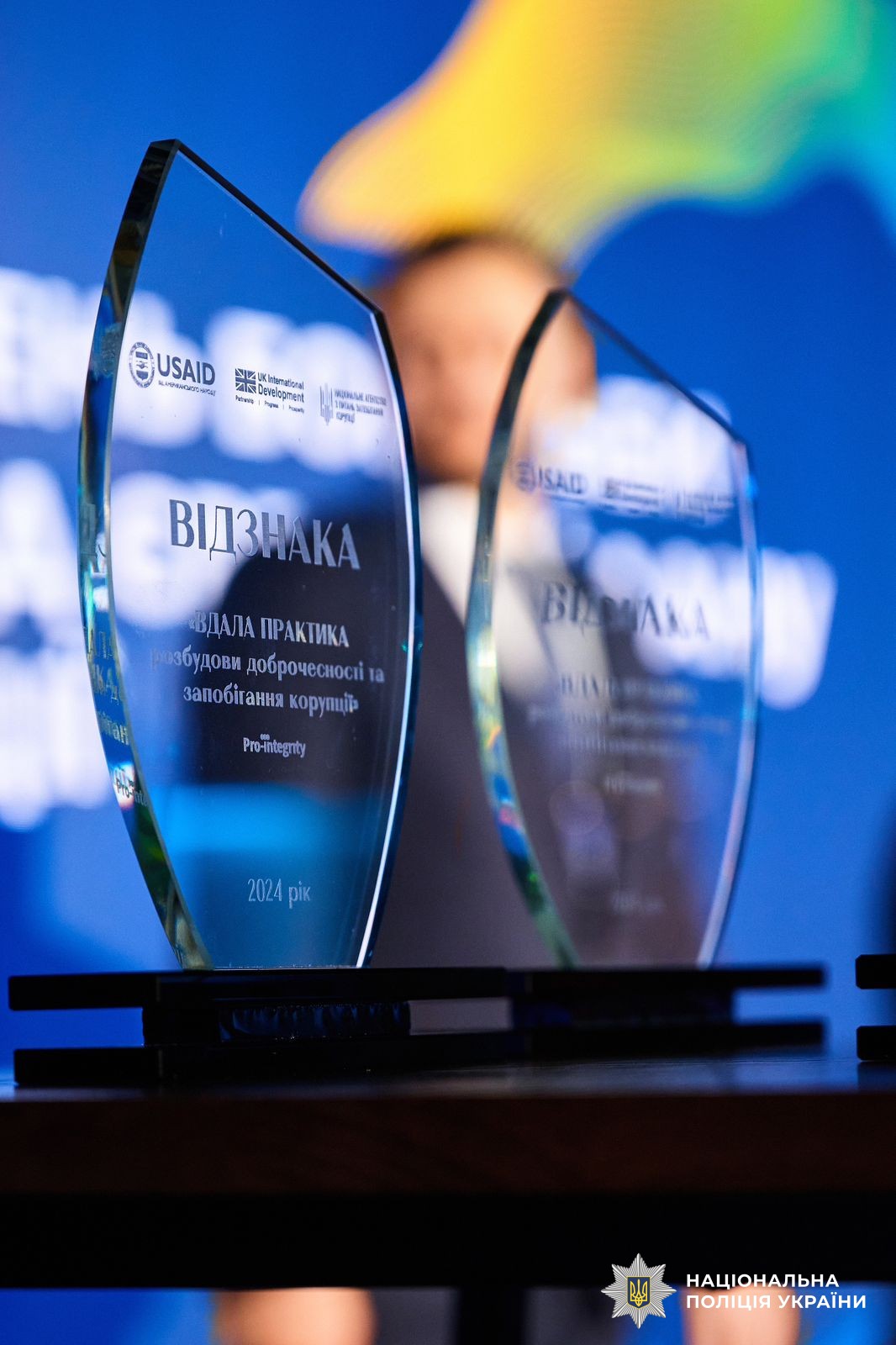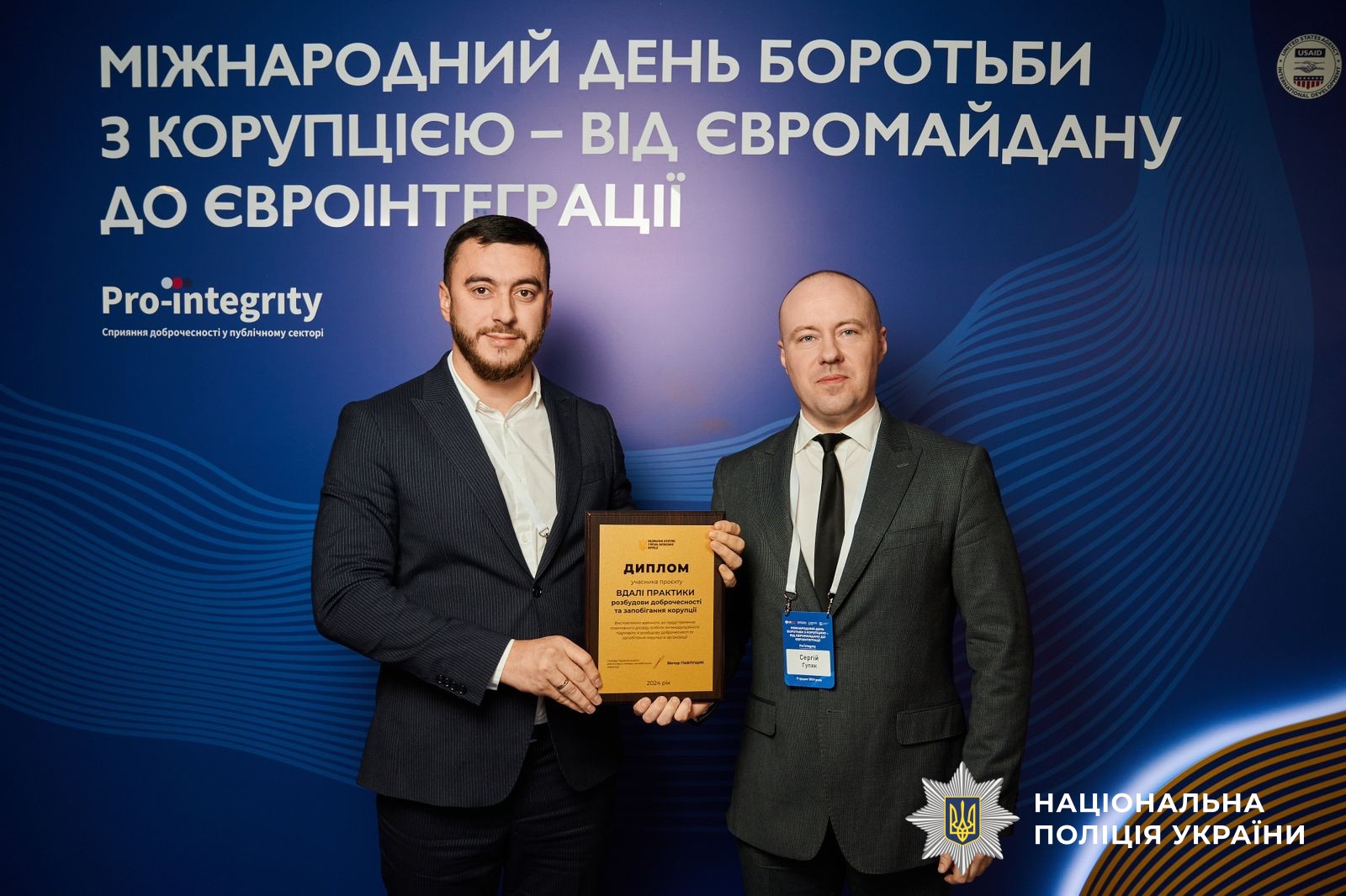 Наприкінці форуму нагороджено переможців конкурсу кращих практик антикорупційних уповноважених. Позитивний досвід антикорупційного підрозділу Національної поліції України відзначено дипломом за вдалі практики розбудови доброчесності та запобігання корупції.