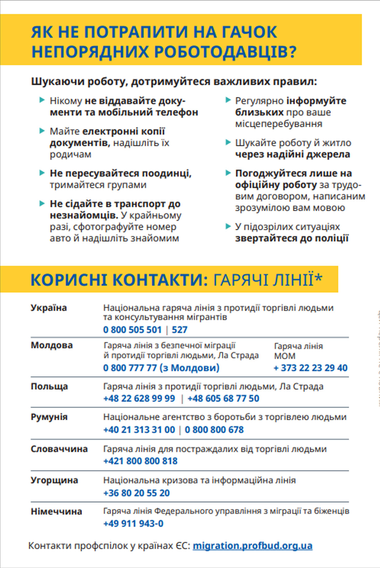 - 527 (з мобільного) або 0 800 505 501 (з мобільного чи стаціонарного) — Національна гаряча лінія з протидії торгівлі людьми та консультування мігрантів