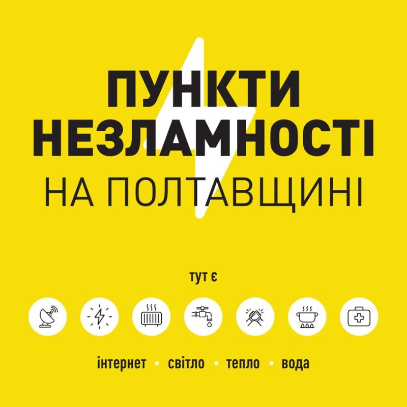 На Полтавщині працюють Пункти незламності. У них під час довготривалих вимкнень електроенергії можна отримати базові послуги: тепло, воду, живлення для мобільних, місця для відпочинку, аптечки, забезпечення для мам і дітей. Безкоштовно й цілодобово.
