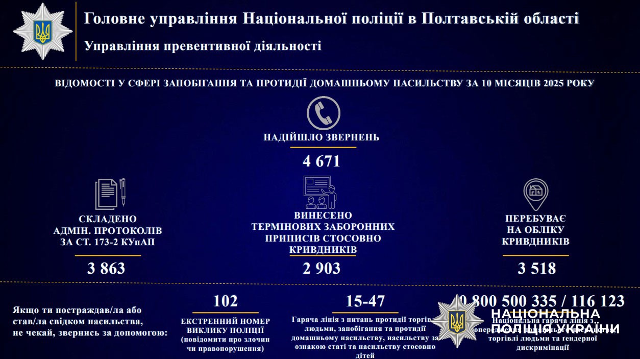 За інформацією Управління превентивної діяльності поліції Полтавщини, лише за 10 місяців цього року до підрозділів поліції області надійшло 4671 звернення про факти домашнього насильства. За результатами реагування поліцейські склали 3863 адміністративних протоколи за ст. 173-2 Кодексу України про адміністративні правопорушення, а щодо кривдників винесли 2903 термінових заборонних приписи. Наразі на профілактичному обліку перебуває 3518 осіб, які вчинили домашнє насильство.