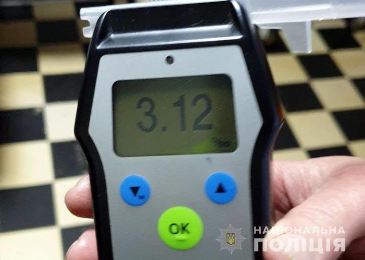 Під час освідування водія автомобіля «Део» на приладі «Драгер», в його крові виявлено 3,12 проміле алкоголю, що перевищує допустиму норму більше, ніж у 10 разів.