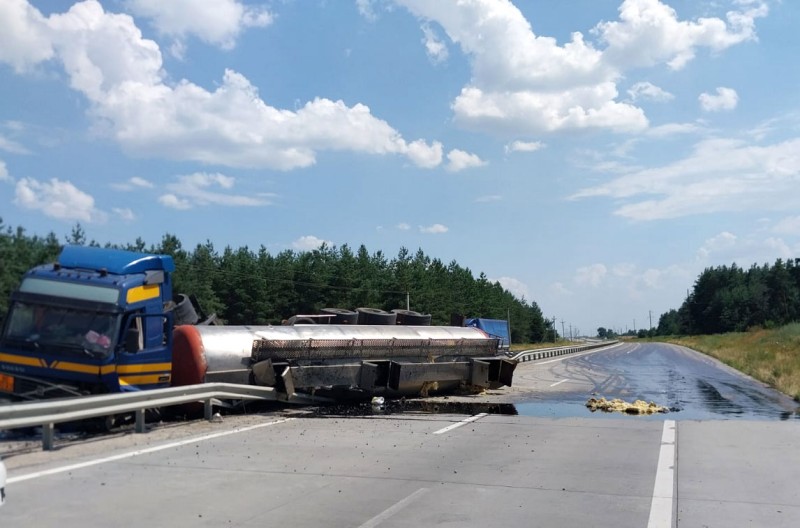 Попередньо відомо, що водій вантажівки «Вольво», 1970 року народження, мешканець Кременчука, під час руху допустив перекидання авто з цистерною.
