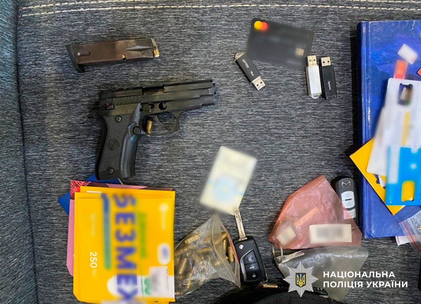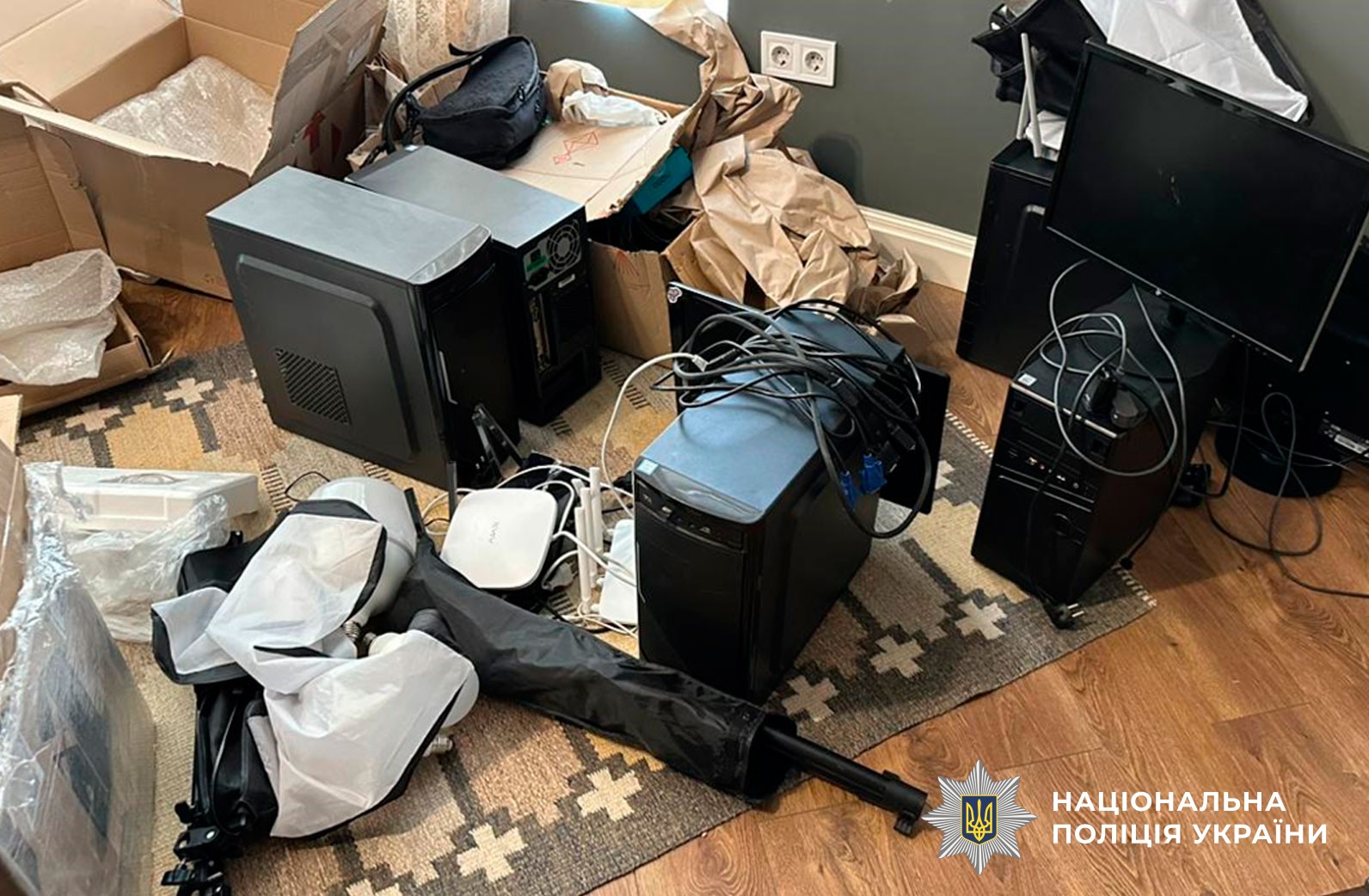 «Під час санкціонованих обшуків за адресами розташування «студій», в автомобілі та у квартирах фігурантів слідчі вилучили понад два десятки мобільних телефонів, понад 40 скретч- та сім-карт різних операторів мобільного зв’язку, десяток системних блоків, вебкамери, ноутбуки, маршрутизатори, роутери, штативи з освітлювальними лампами та інше приладдя, що використовувалося для виготовлення порнографічної продукції. Серед вилученого також пістолет та 40 набоїв до нього, більш як два десятки банківських карт, фіскальні чеки на придбання валюти, а також готівка».
