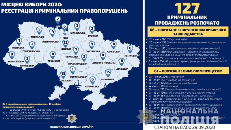 Вибори-2020: за добу поліцейські відкрили десять кримінальних проваджень за фактами порушень виборчого процесу (від 29.09.2020)