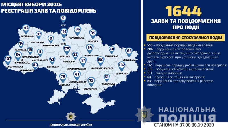 Усього ж із 5 вересня територіальні органи Національної поліції зареєстрували 1644 повідомлення, пов’язаних із виборчим процесом.