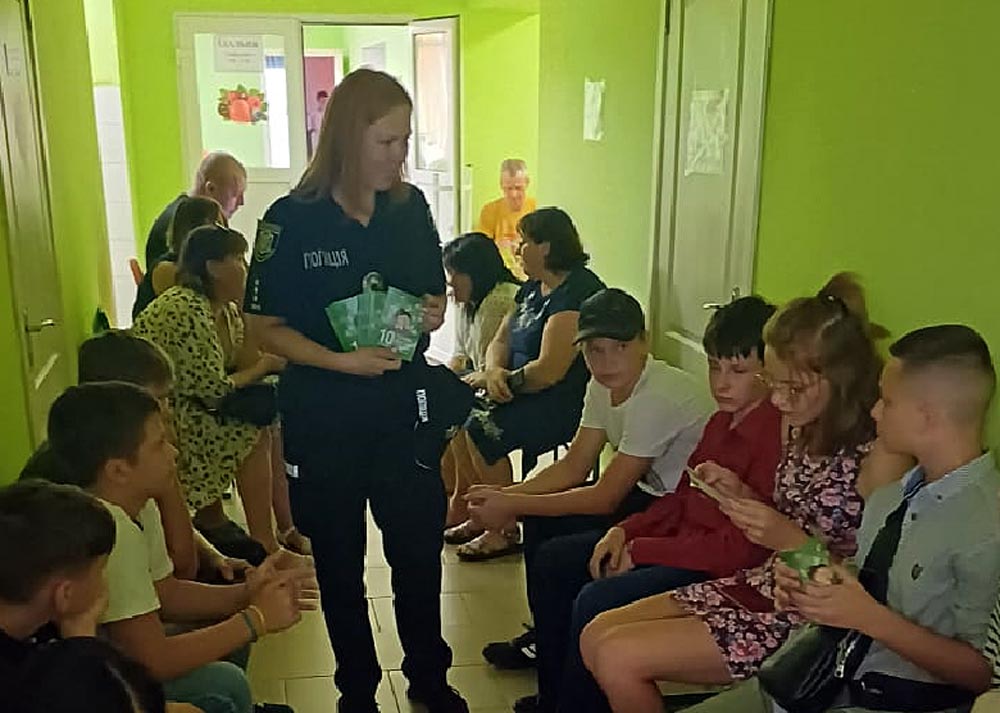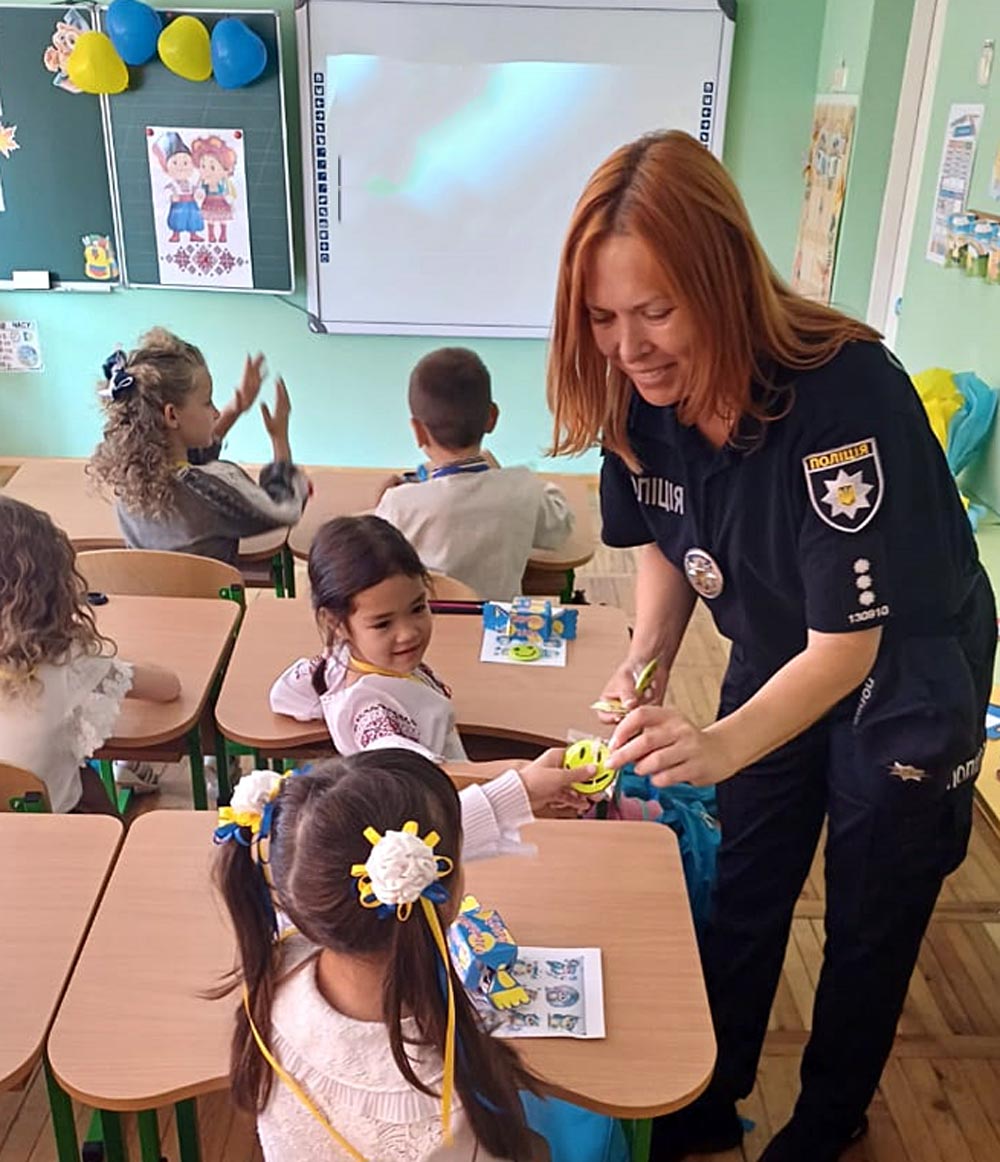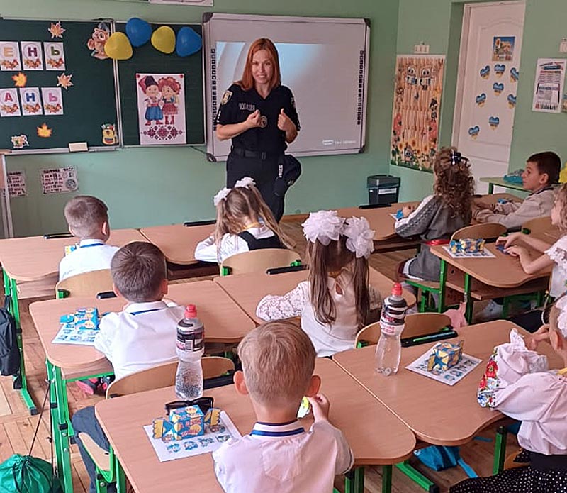Там поліцейські продовжили спілкування з дітьми та повторили правила безпеки під час навчального процесу в умовах війни. Під час спілкування працівники ювенальної поліції вручили першокласникам світловідбивні елементи, аби на дорозі бути помітними для водіїв у темний час доби.