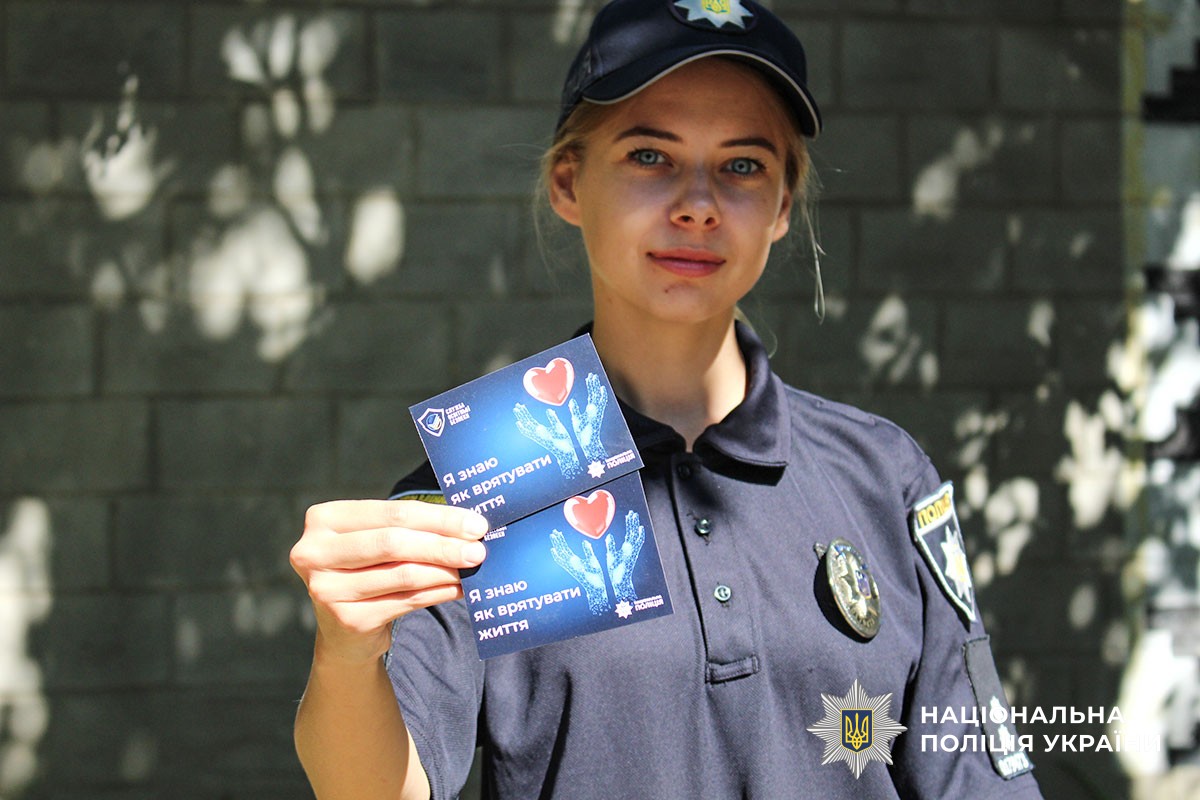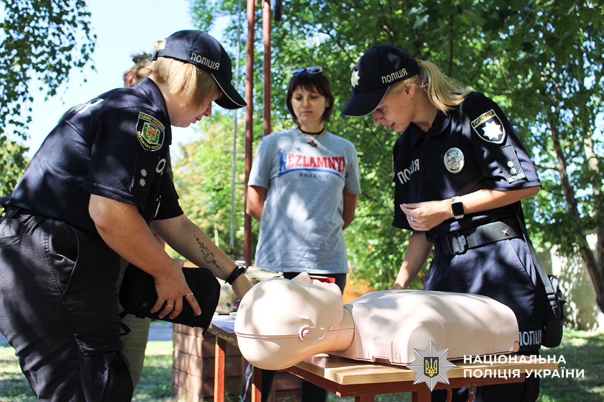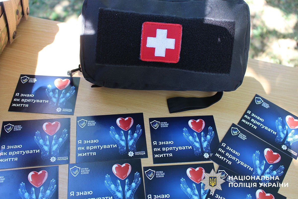Правоохоронці ознайомили школярів із вмістом аптечки й пояснили, які препарати та засоби там мають бути, навчали визначати наявність дихання за принципом «Бачу, чую, відчуваю» та нагадали, куди слід звертатися у разі виникнення надзвичайної ситуації.