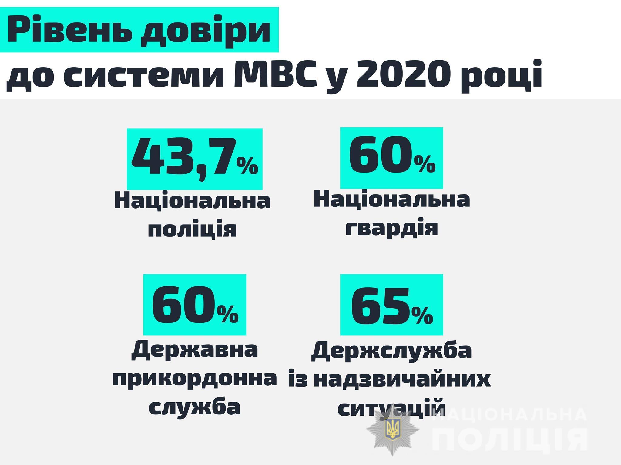 За даними найбільших незалежних соціологічних служб, зокрема Українського центру економічних та політичних досліджень імені Разумкова, на лютий 2020 року рівень довіри до підрозділів системи МВС становить: