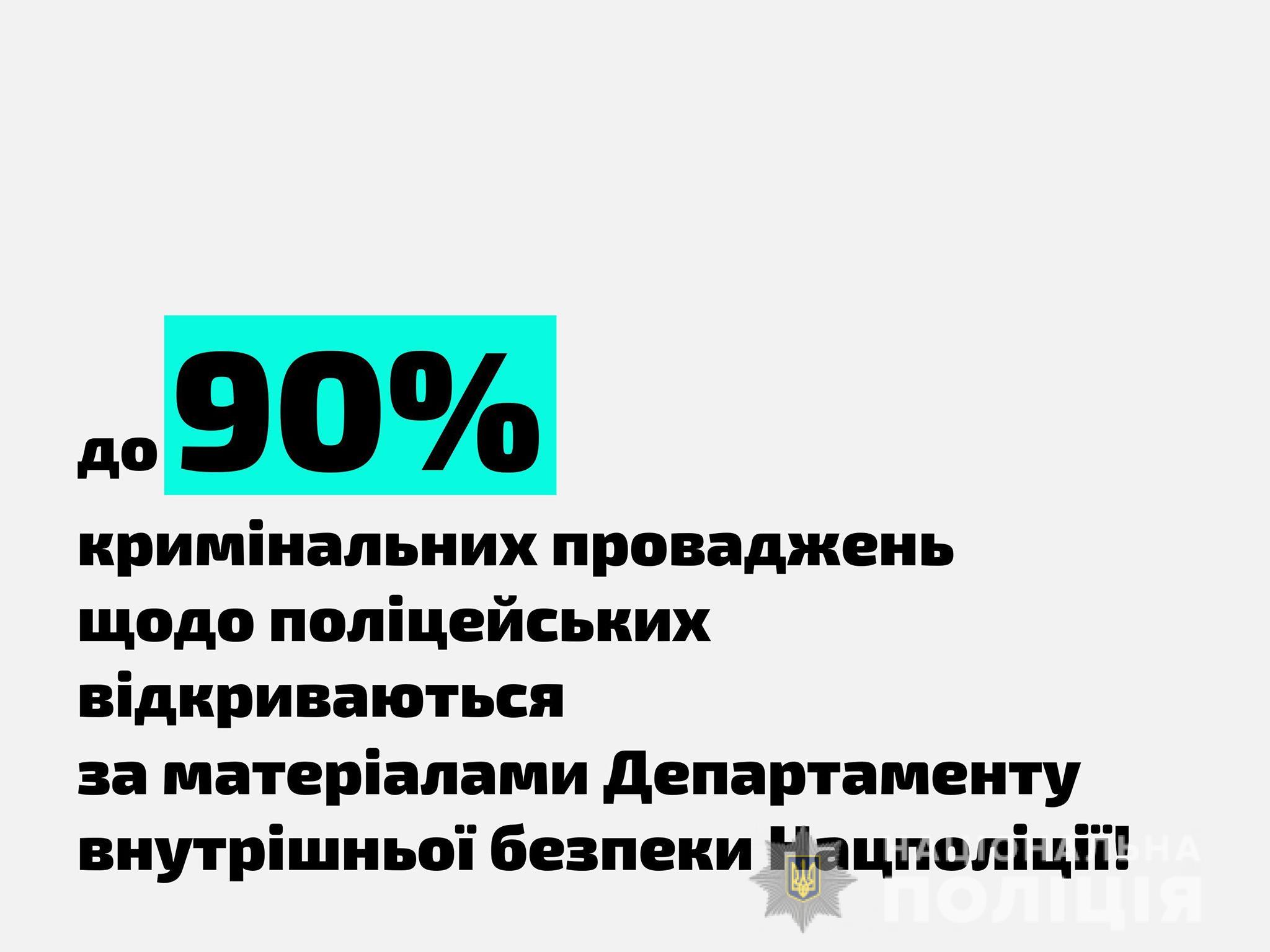 Підкреслюю, що саме за матеріалами Департаменту внутрішній безпеки Національної поліції Державним бюро розслідувань відкриваються до 90 відсотків проваджень відносно правоохоронців!